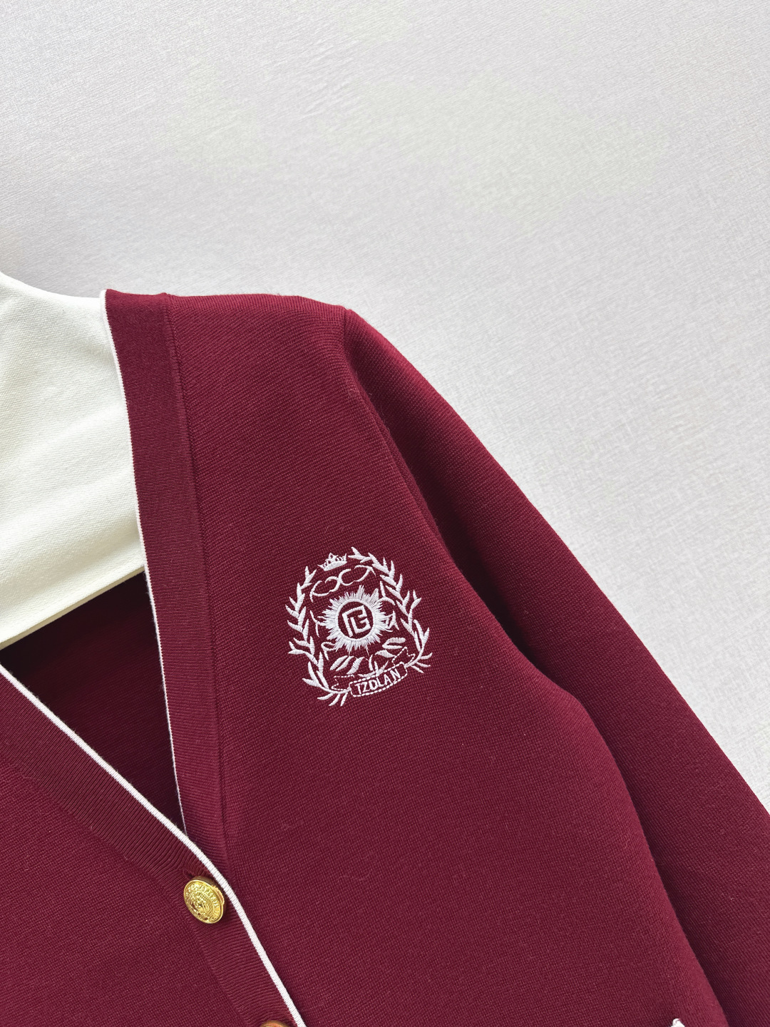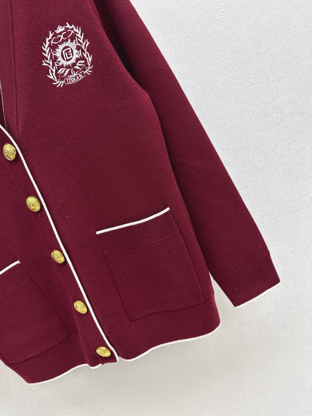 Elevate your style with this Bal V-neck knit cardigan. Crafted from soft wool, this cardigan features a color block trim and gold-tone buttons.