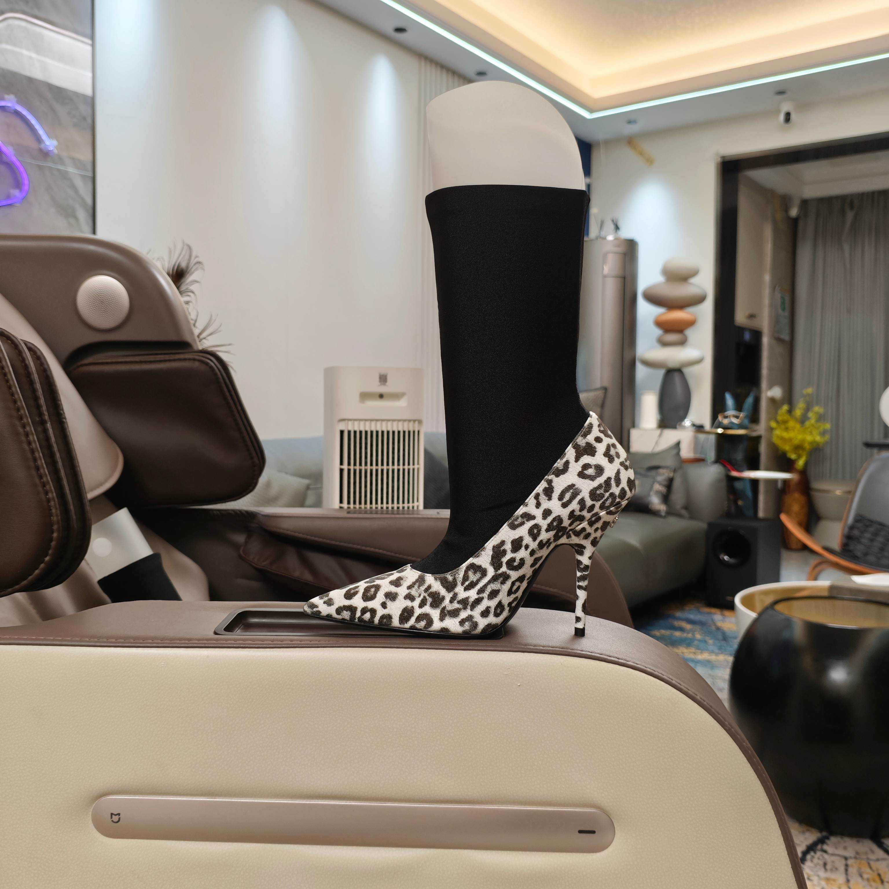 - Material: Leopard print fabric, stretch fabric, leather sole