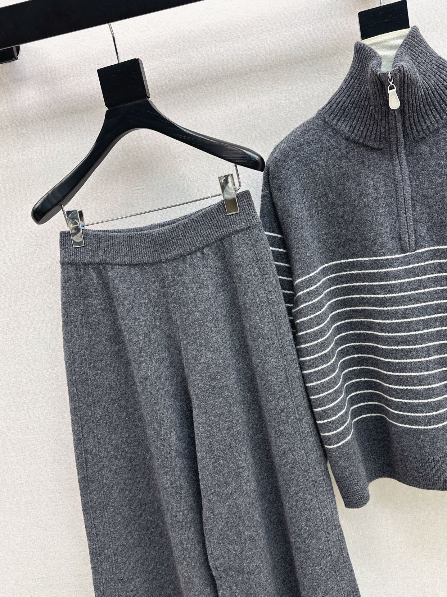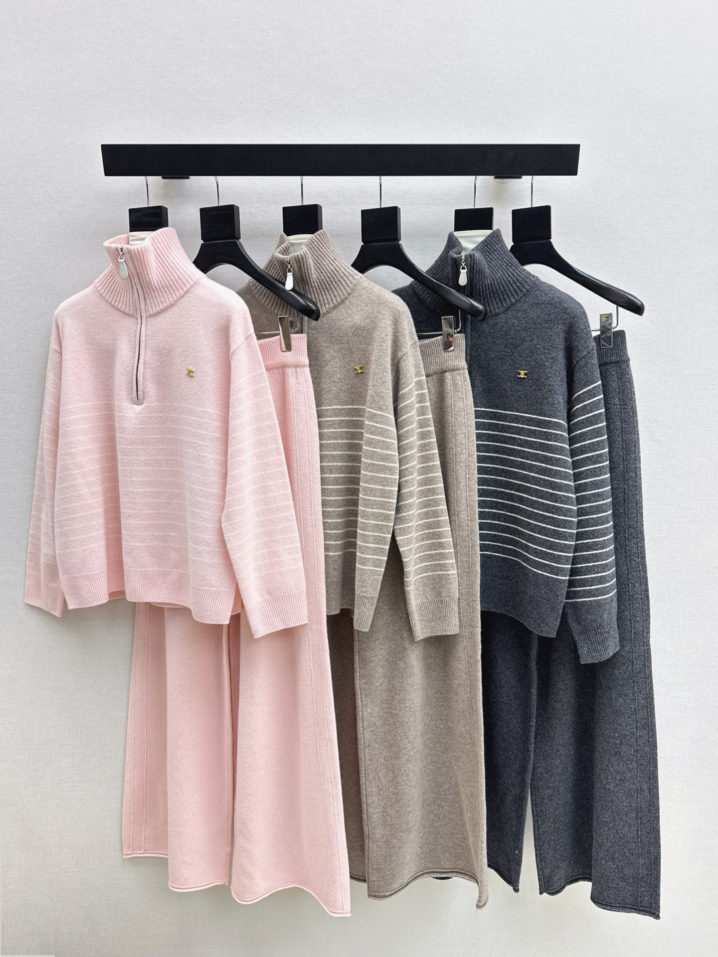 Tags: Celine Wool Set, Designer Lounge Wear, Striped Wool Sweater, Wide Leg Wool Pants, Women's Knit Set, Wool Lounge Set