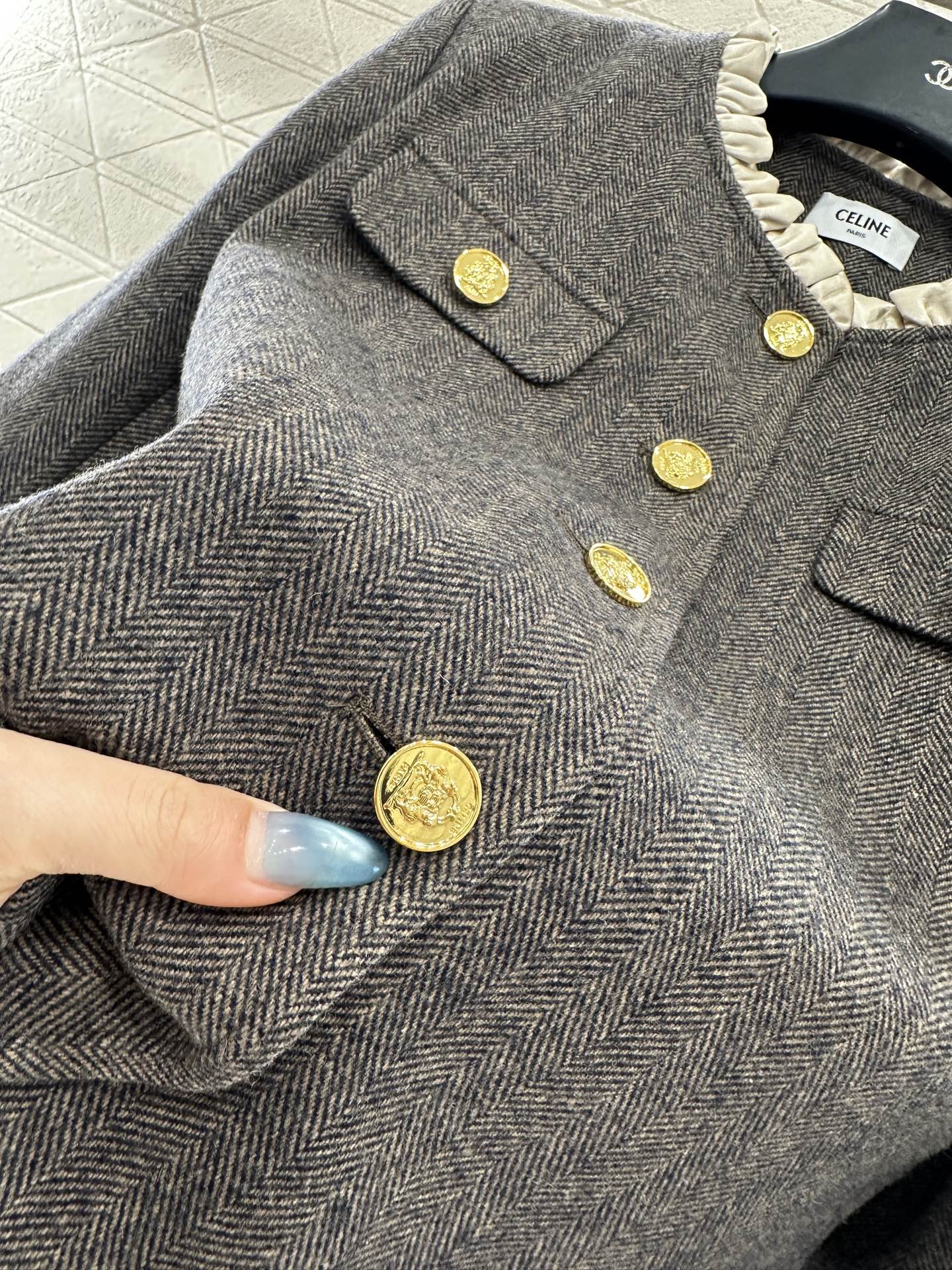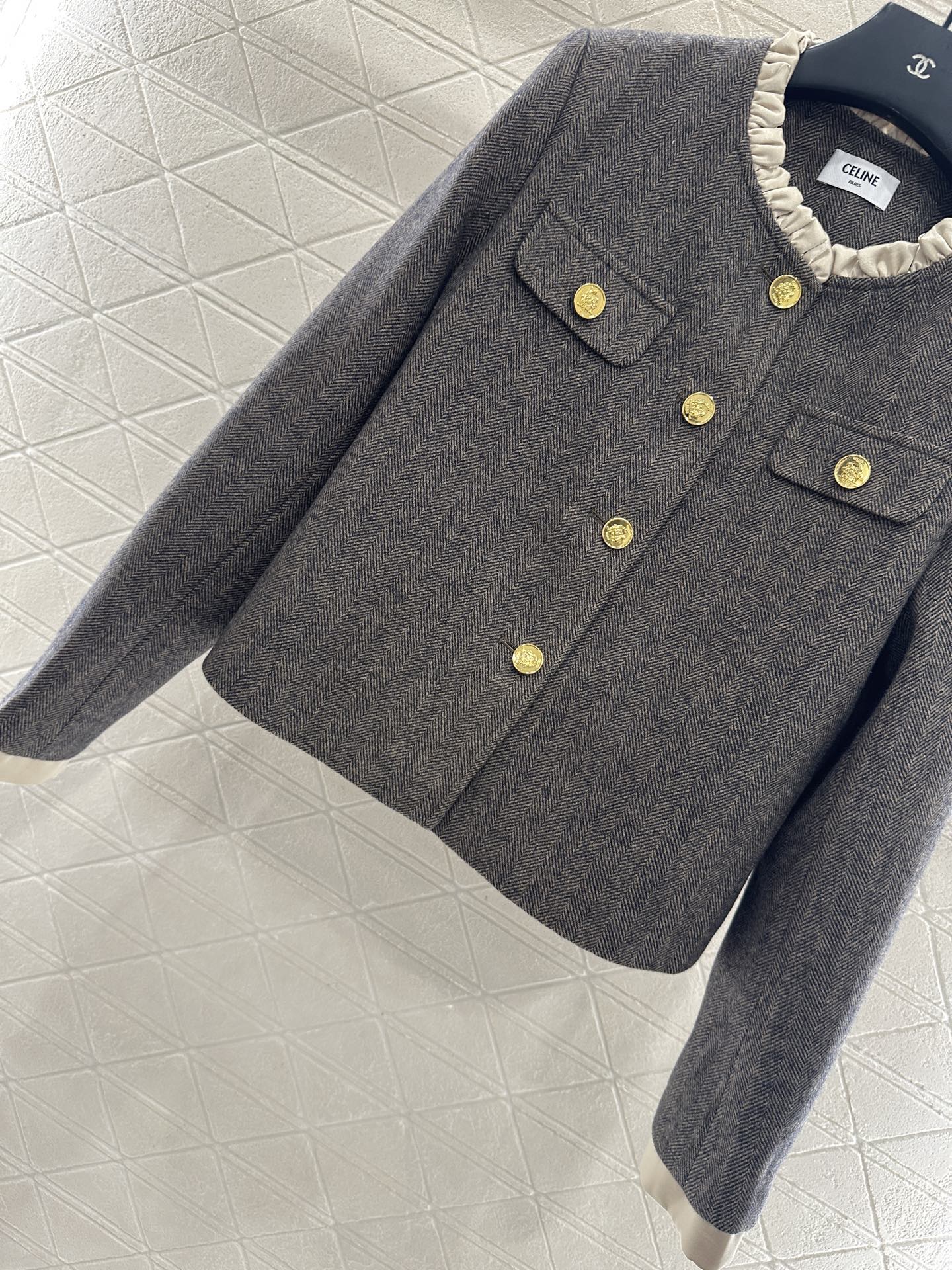 Celine Women's Wool Tweed Jacket with Ruffle Trim and Gold-Tone Buttons