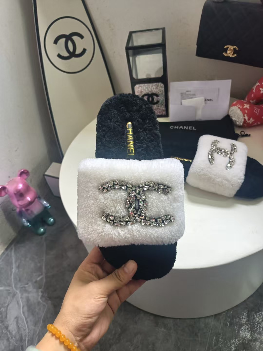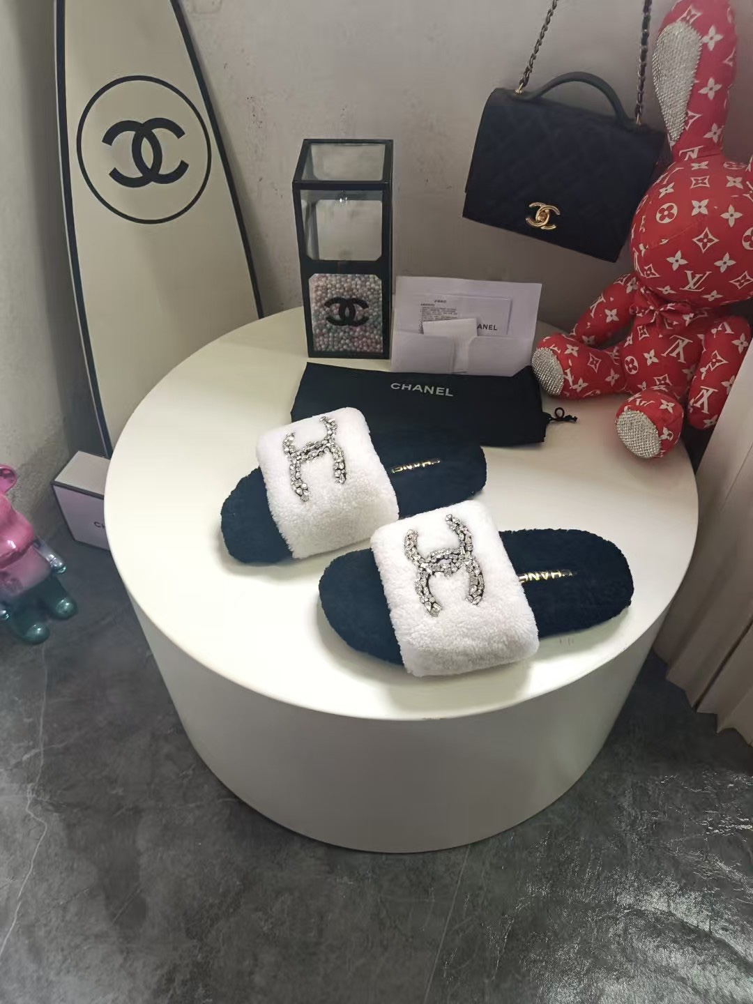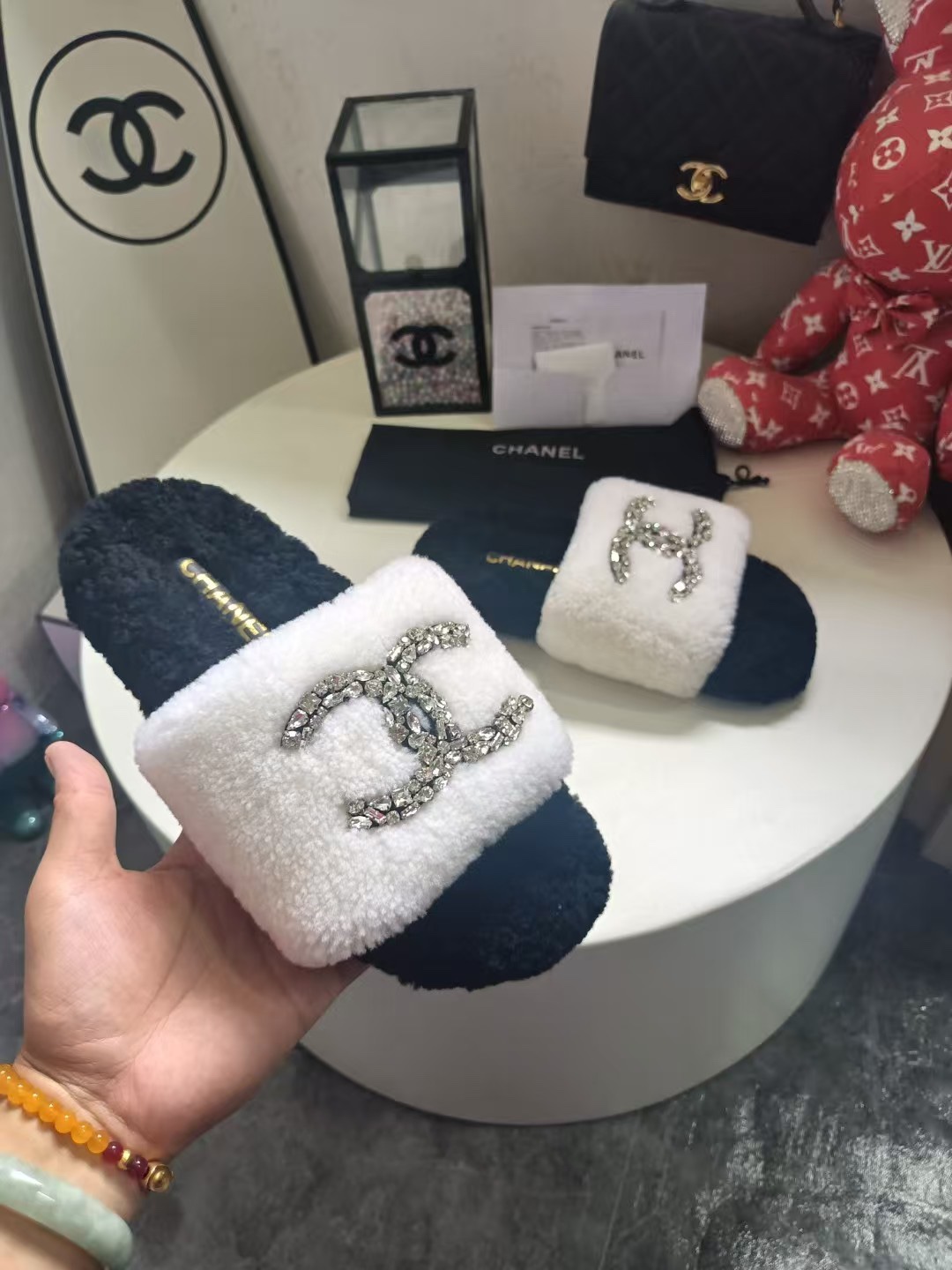 Tags: Chanel Fuzzy Slides, Cozy Warm Slides, Designer Indoor Slippers, Trendy Women's Slides, Women's Fashion Slides