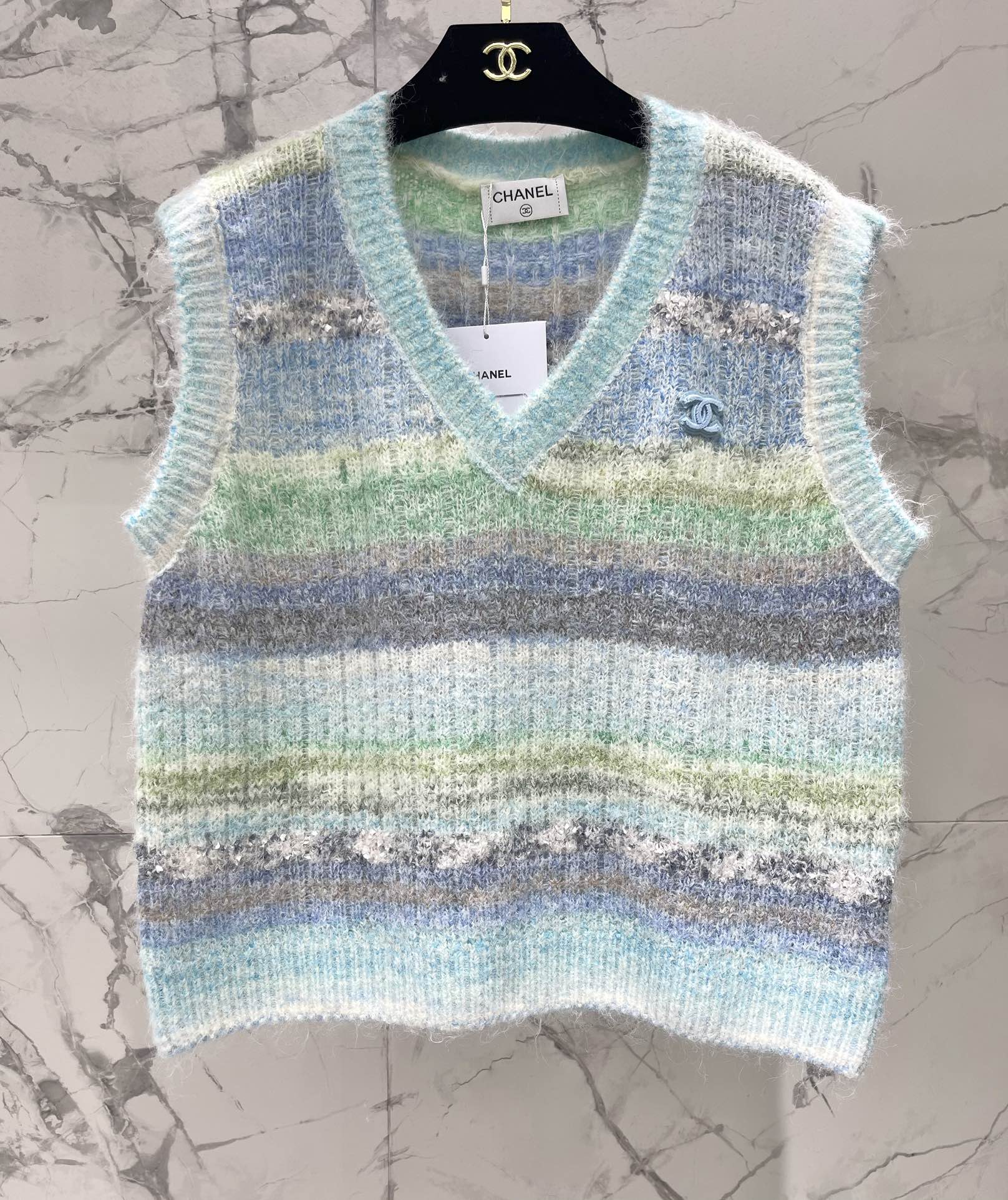 Tags: Chanel Vest Top, Designer Knitwear, Gradient V Neck Vest, Luxury Fashion Top, Mohair Knit Vest, Sleeveless Sweater Knit