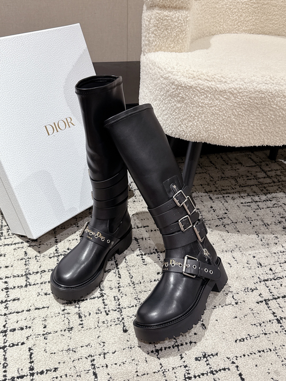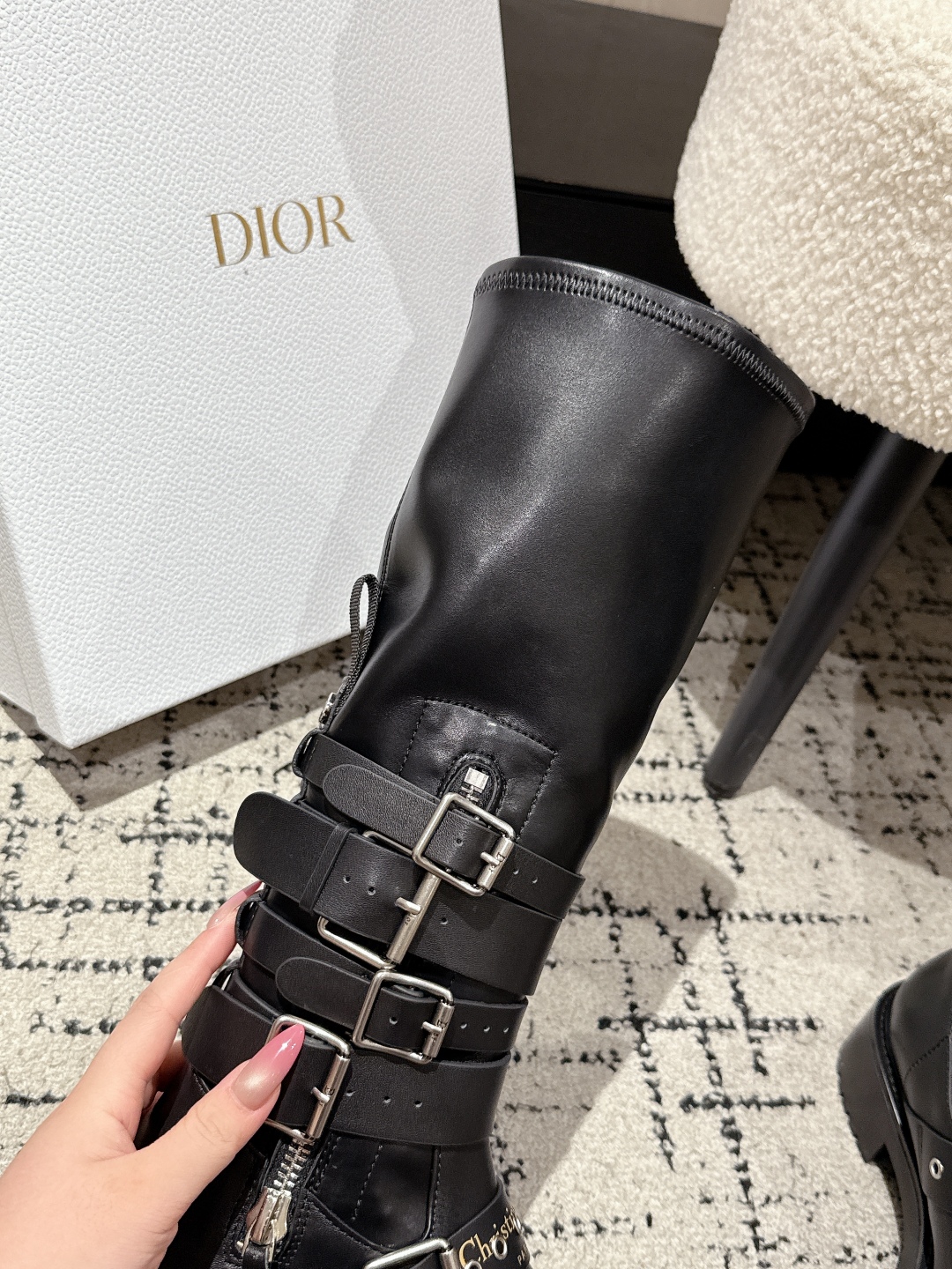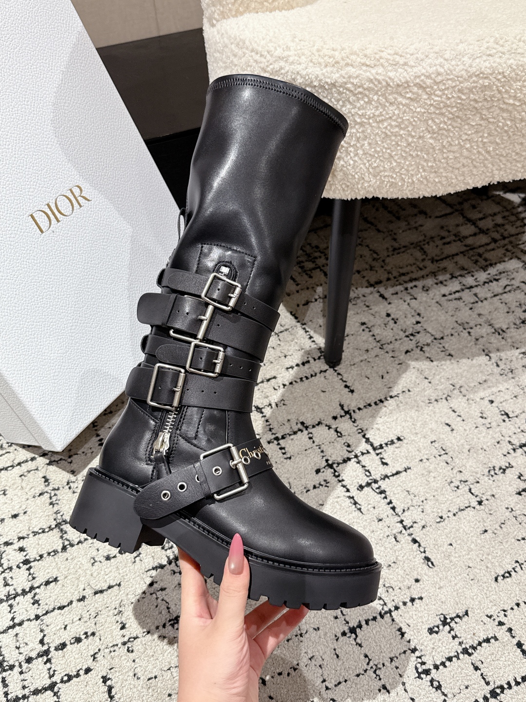 Dior D-Fight Black Leather High Boots for Women with Silver Zipper Detail