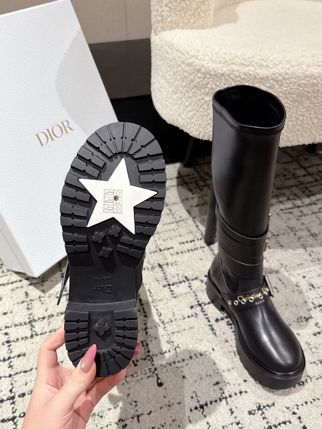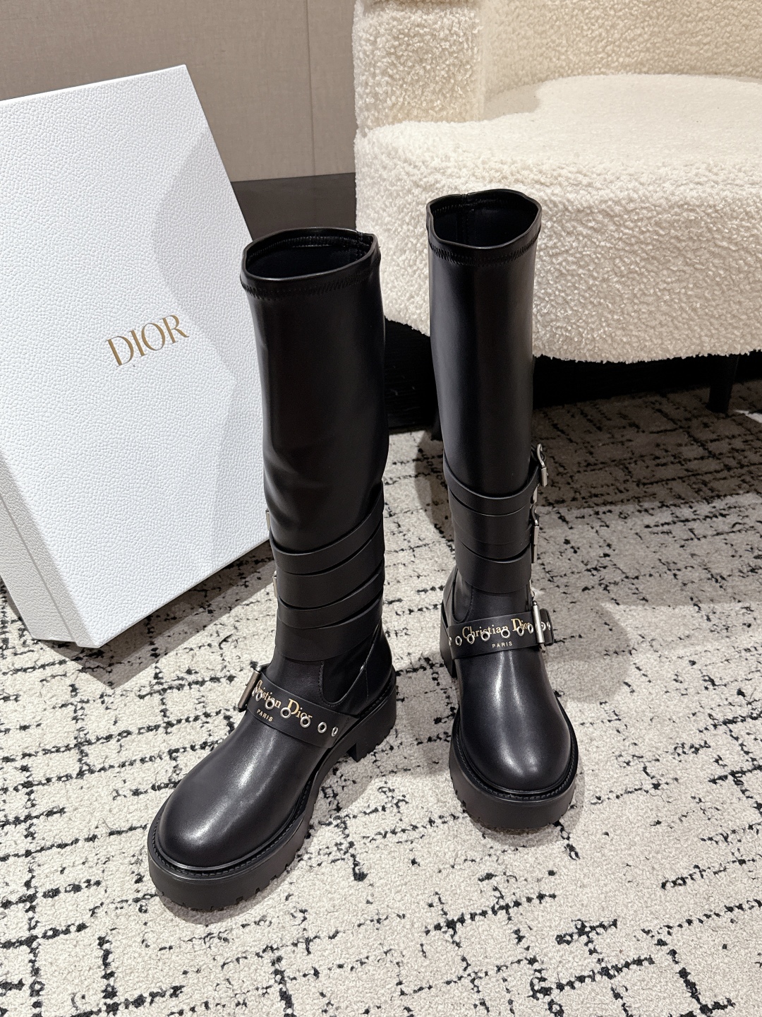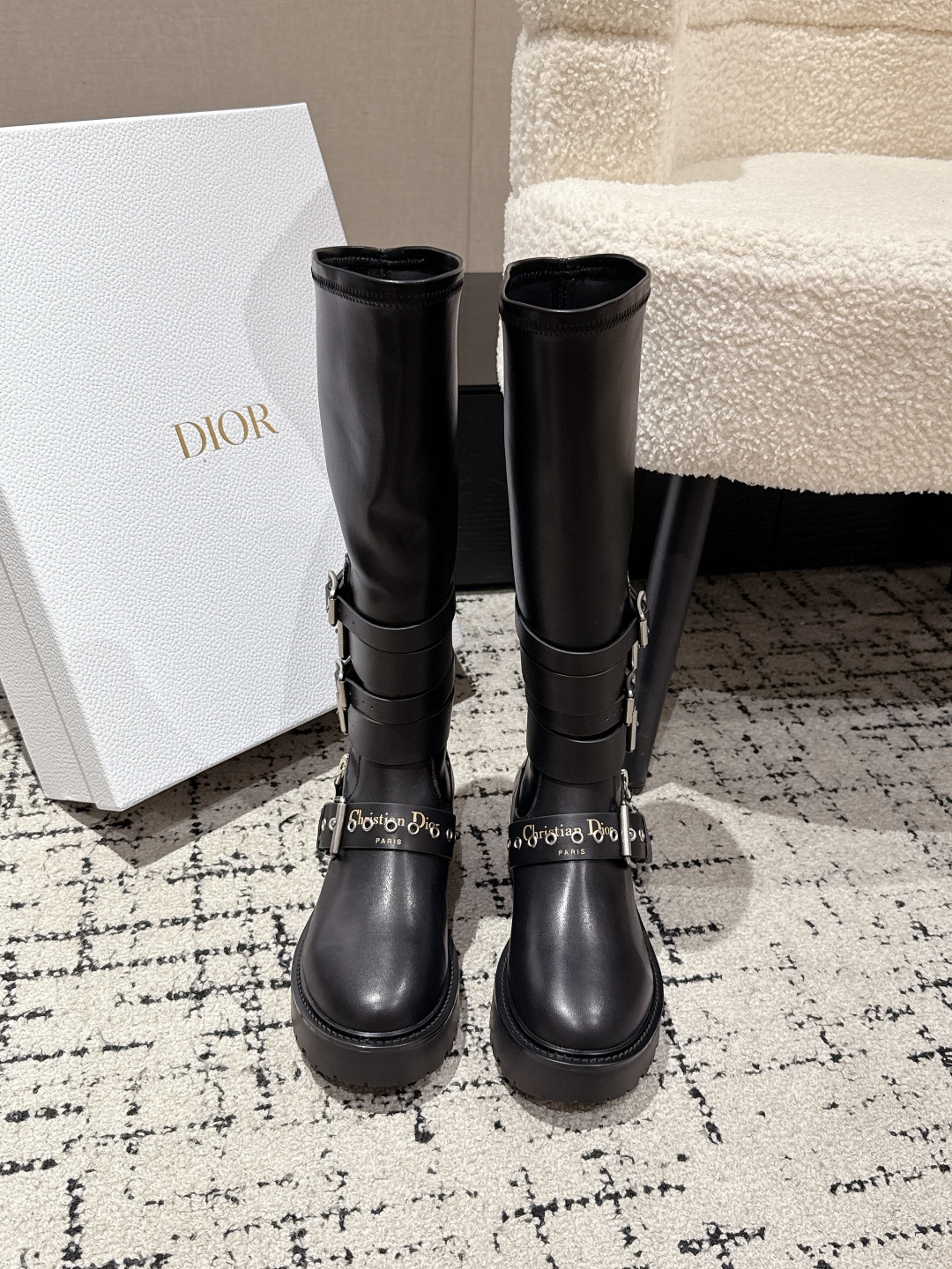 Dior D-Fight Black Leather High Boots for Women with Silver Zipper Detail