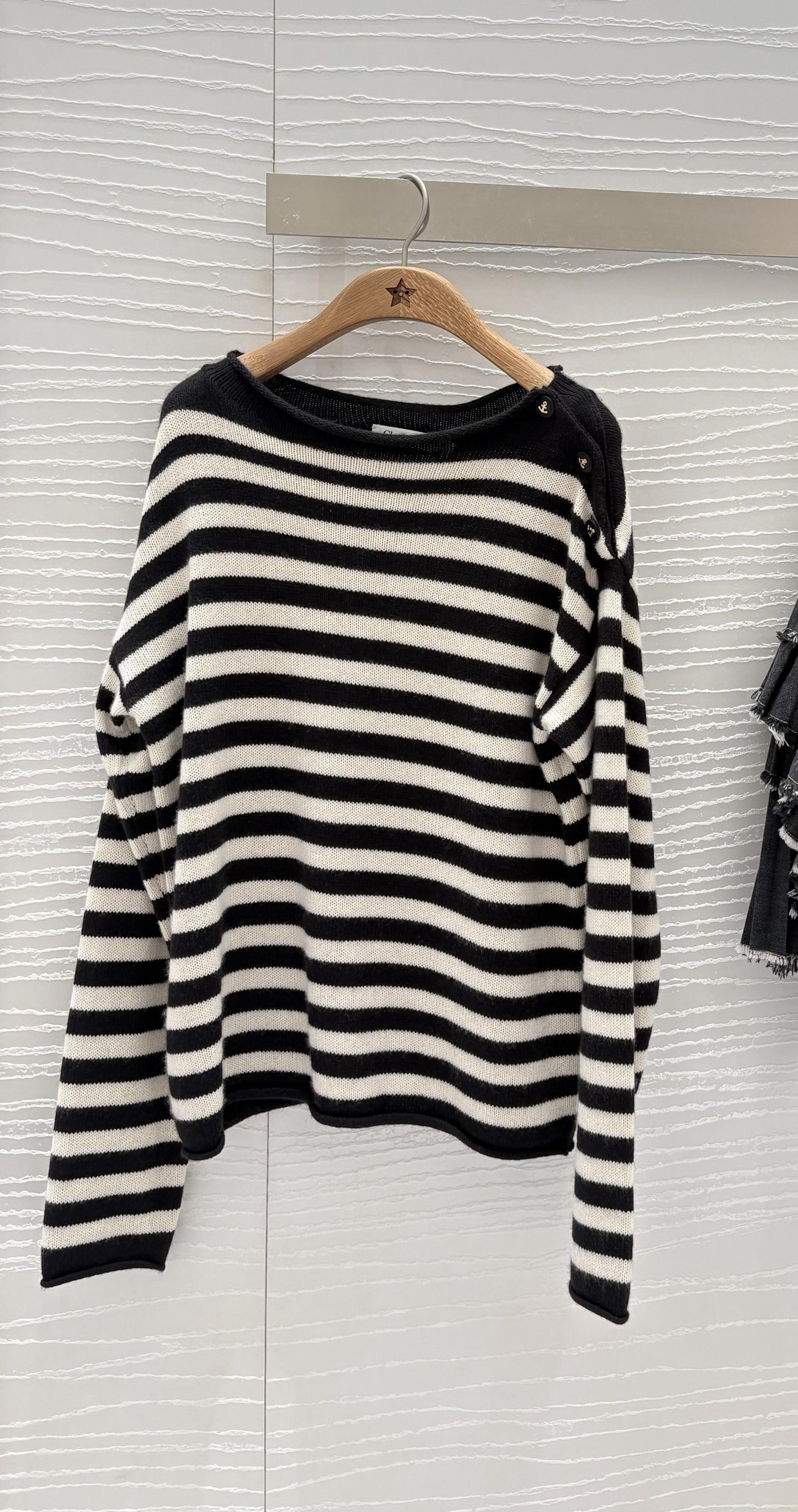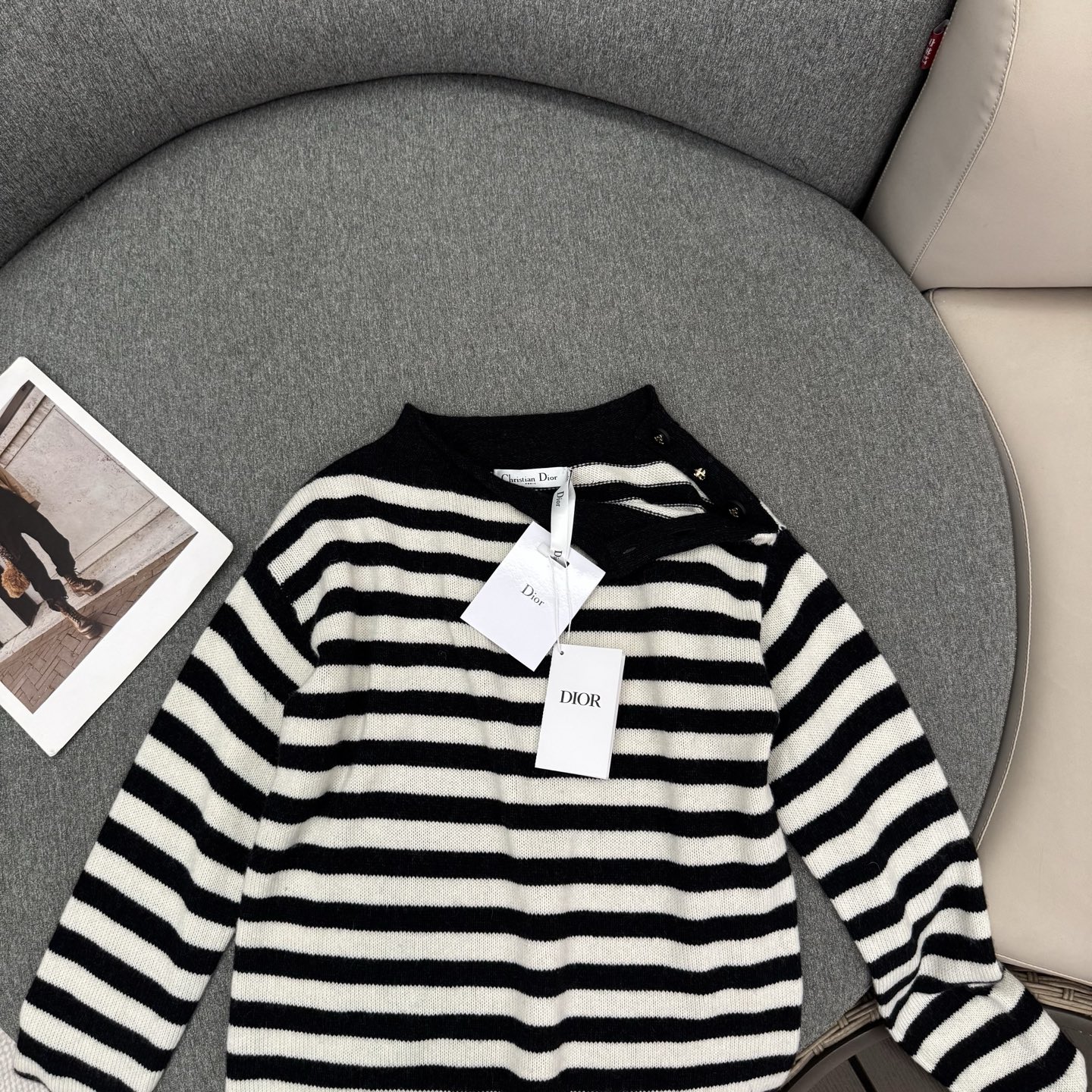 Tags: Autumn Cashmere Top, Designer Knitwear, Dior Women's Sweater, Navy Style Sweater, Shoulder Button Sweater, Striped Cashmere Sweater