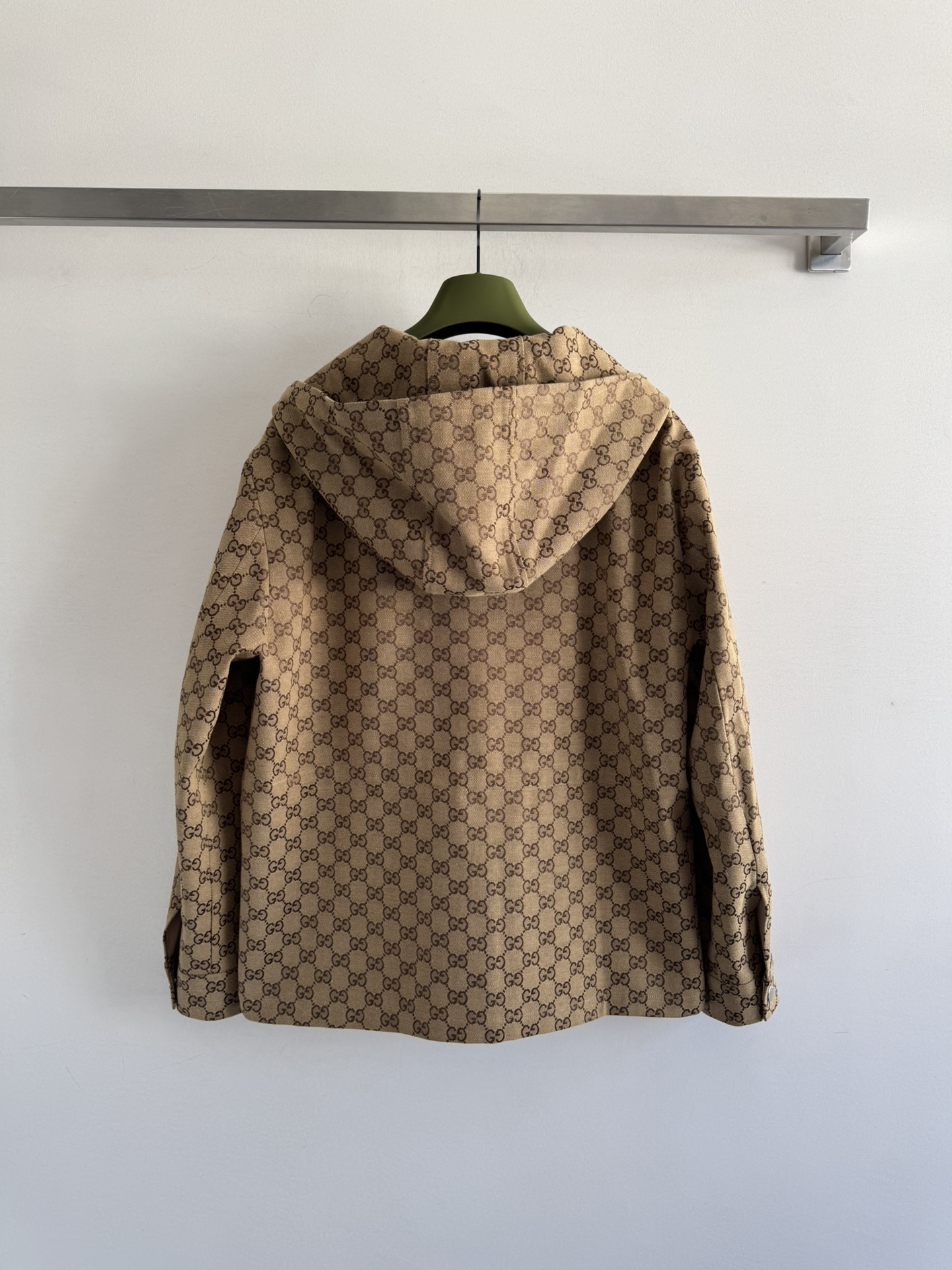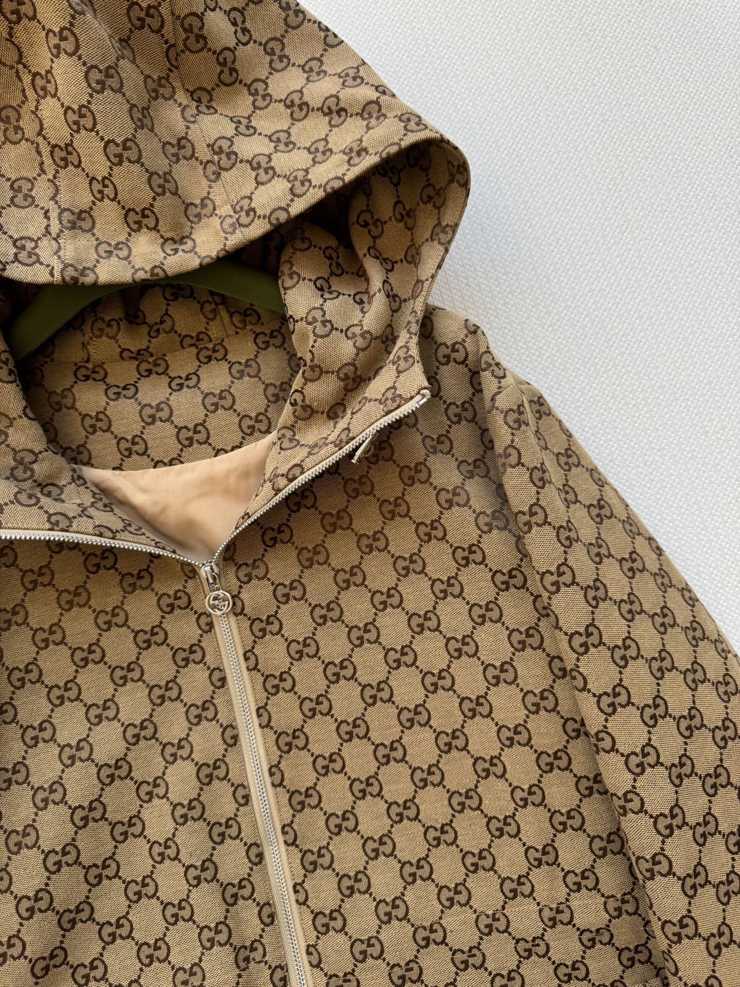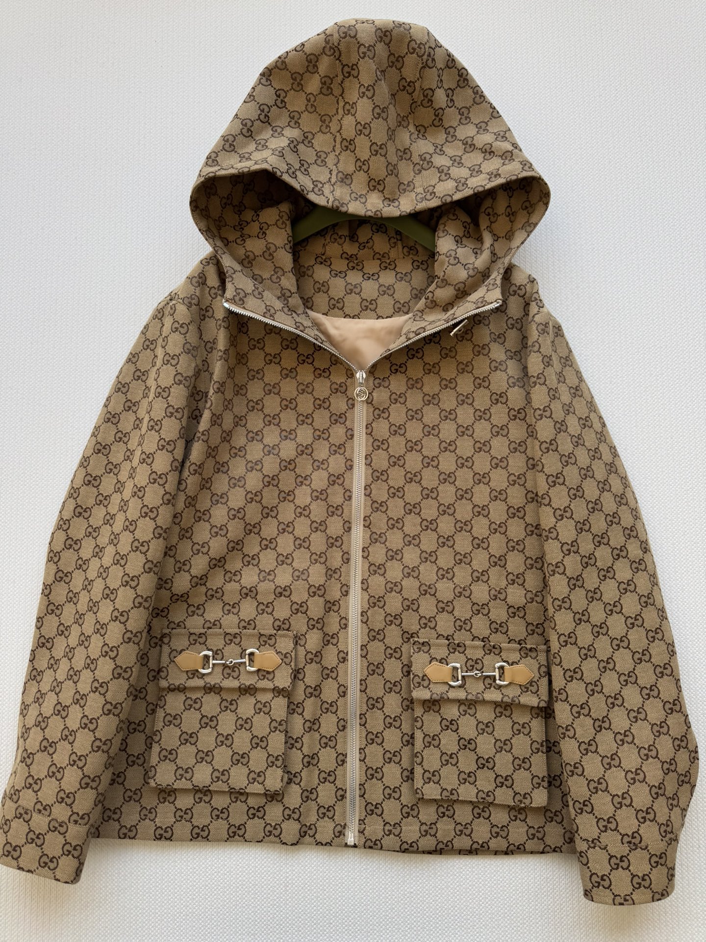 This Gucci monogram hooded jacket is a versatile and stylish addition to any wardrobe. Combining luxury craftsmanship with a comfortable design, this piece is perfect for those who appreciate high-end fashion.