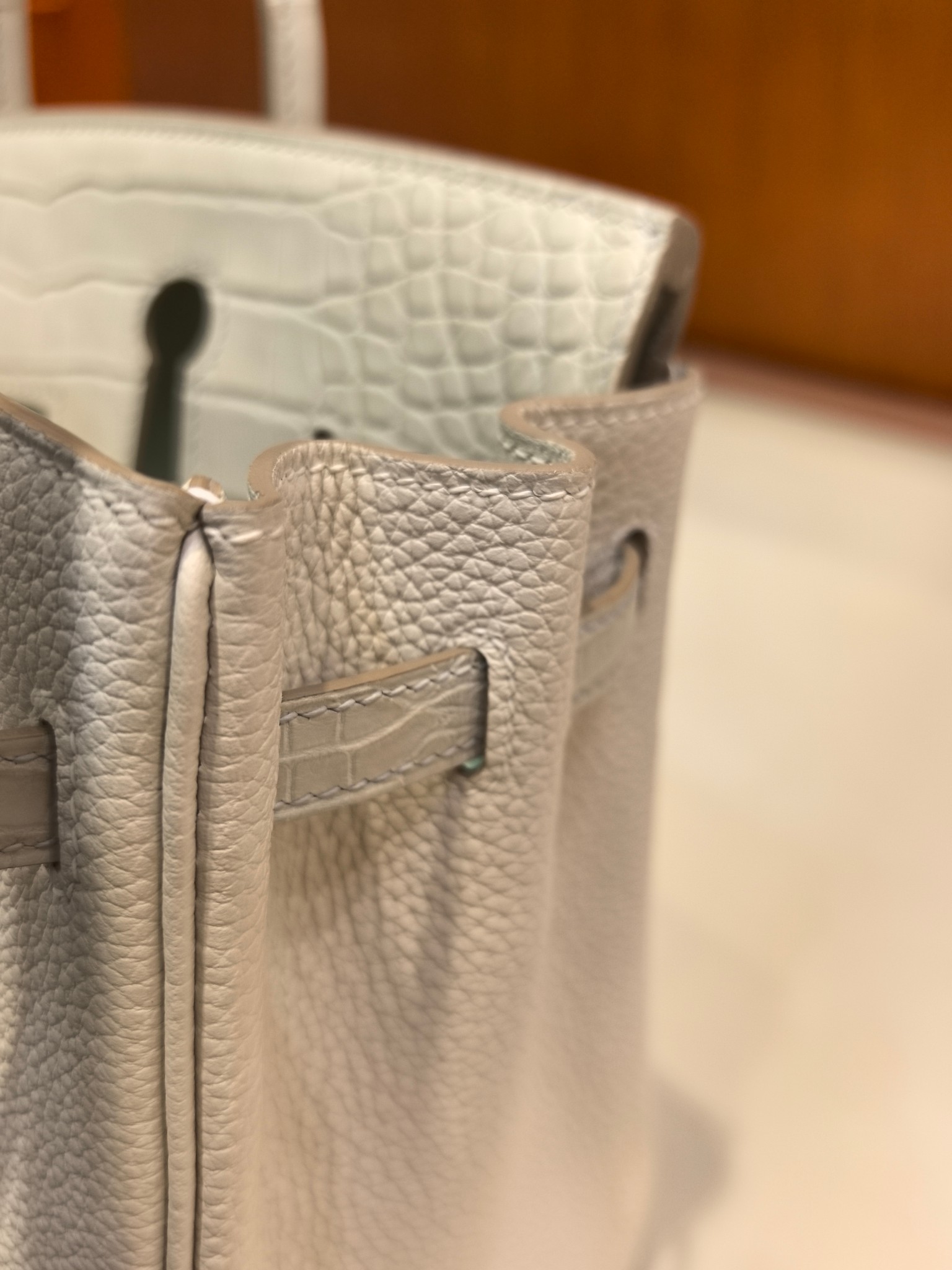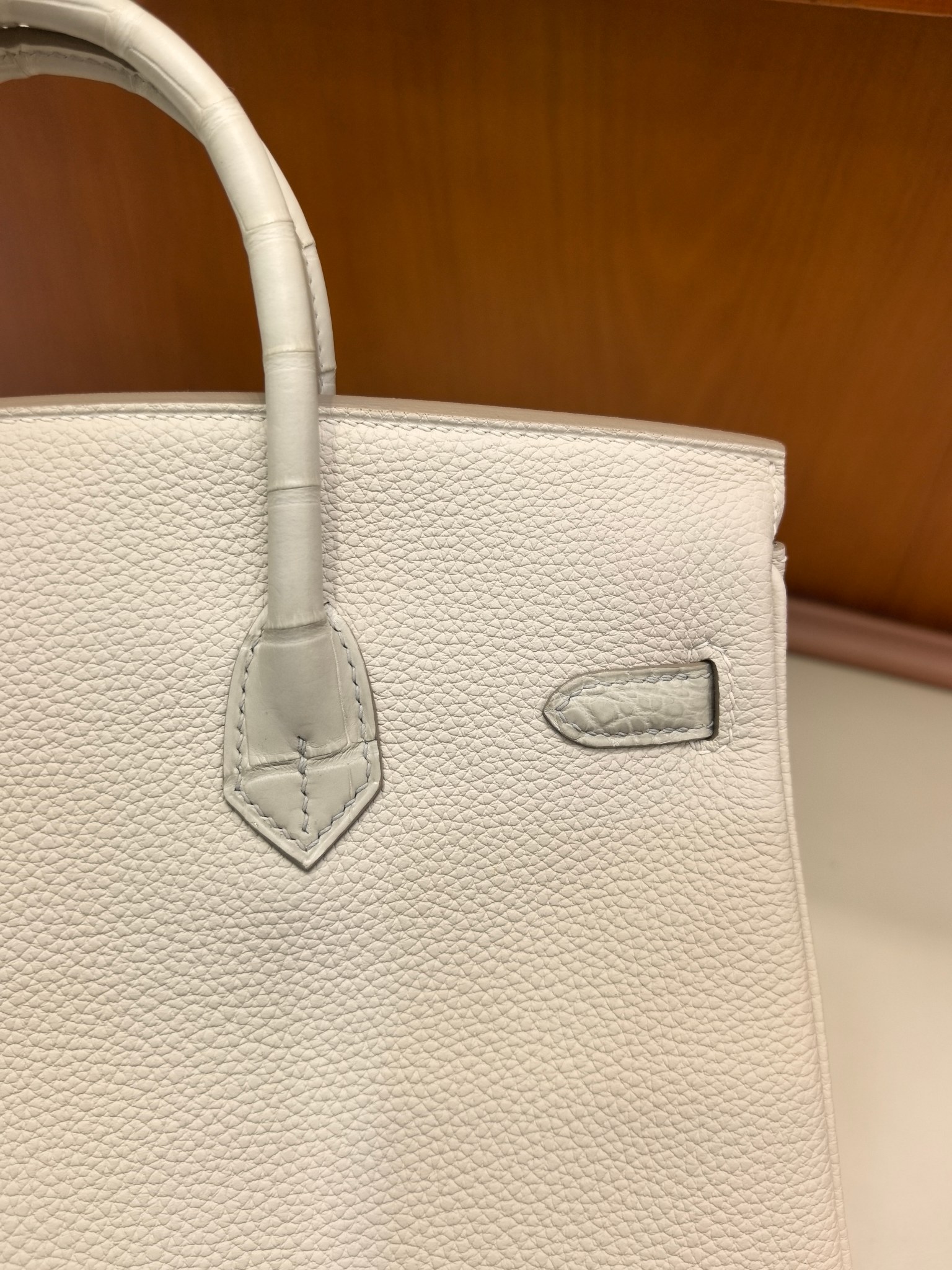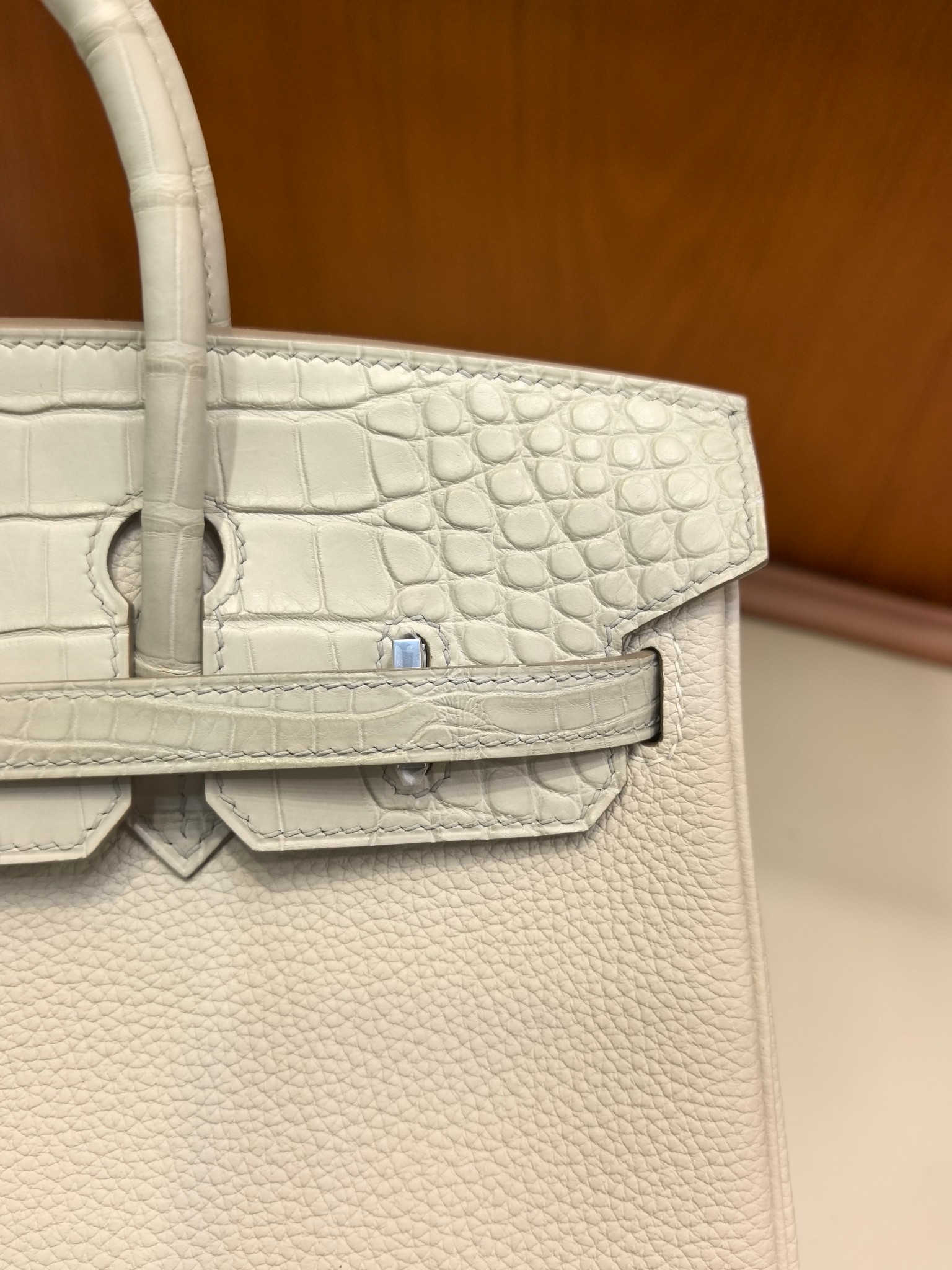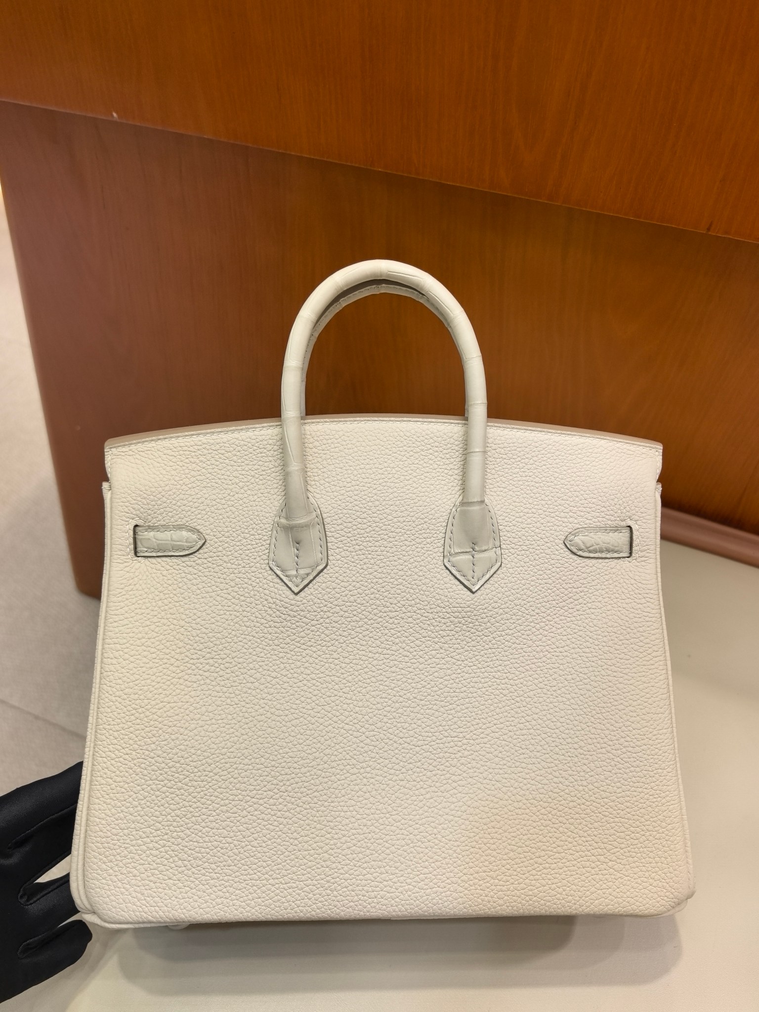 Tags: Alligator Leather Bag, Hermès Birkin 25, Luxury Designer Bag, Silver Hardware Bag, Togo Calfskin Handbag, White Leather Birkin