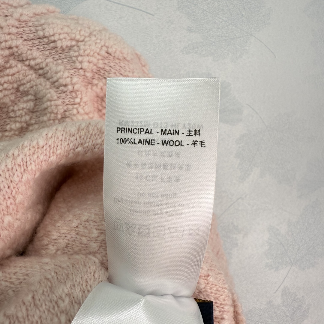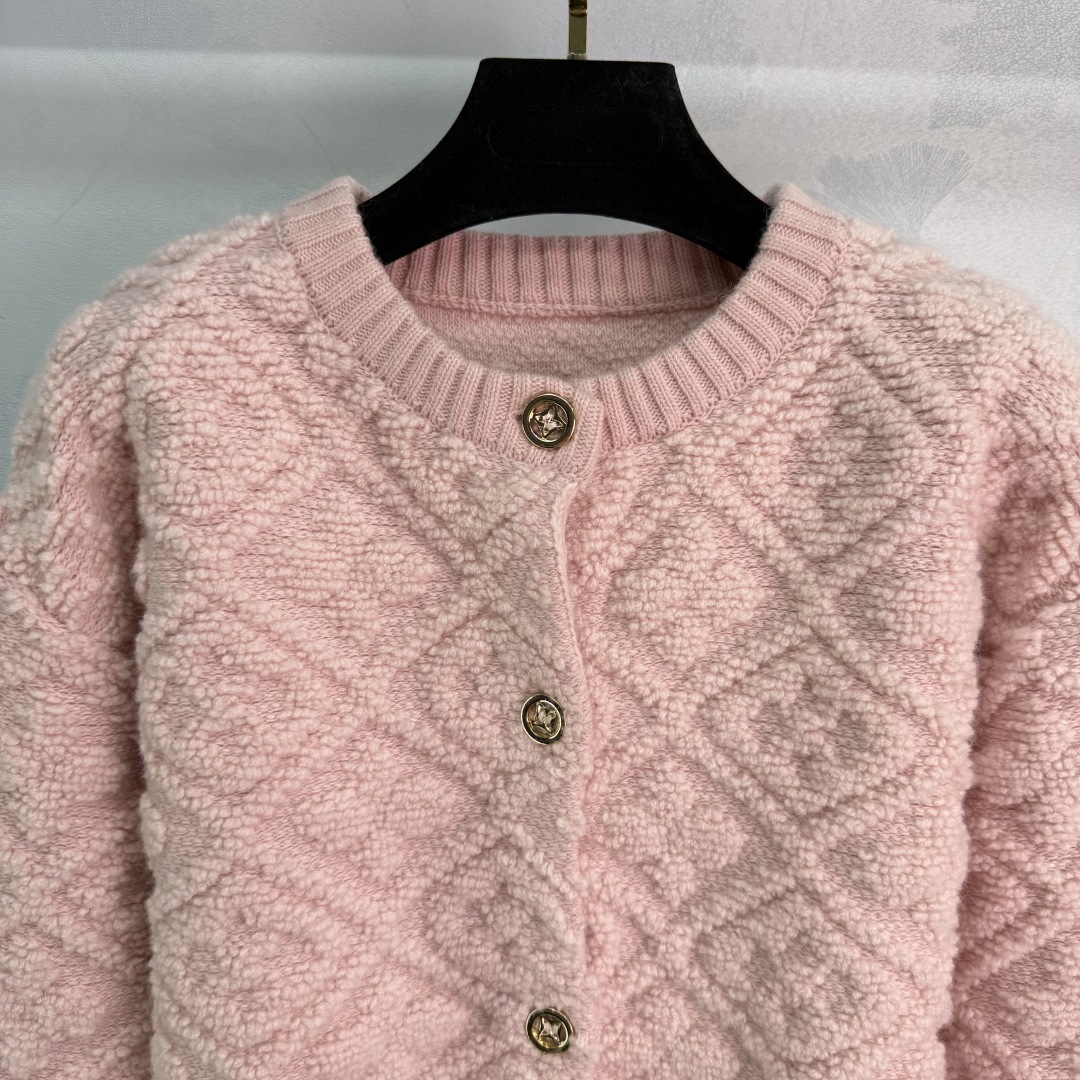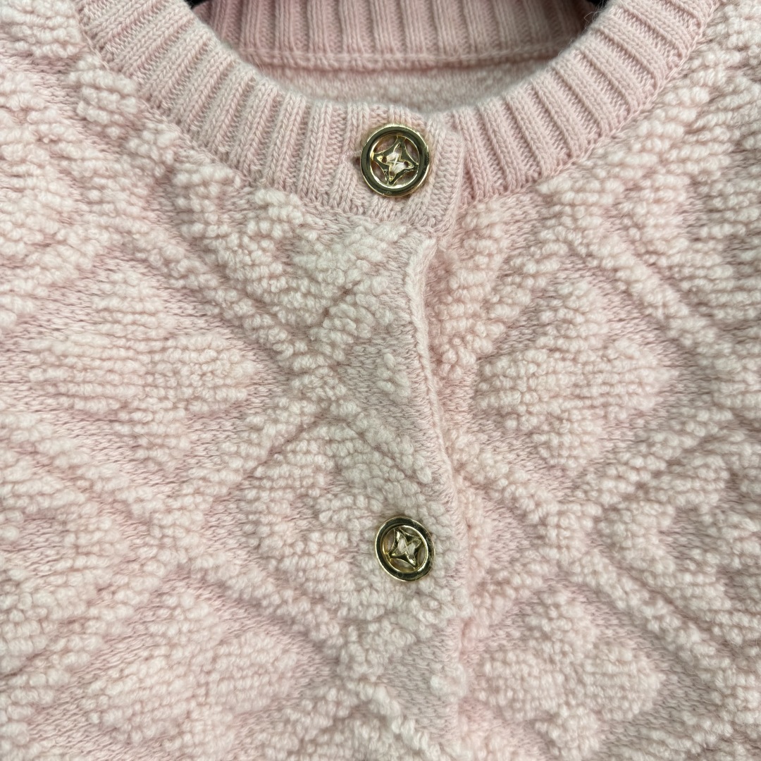 Elevate your style with this pink Louis Vuitton cardigan. Features clover jacquard knit, ribbed trim, and clover logo button closures. Luxurious and chic for Fall 2025.