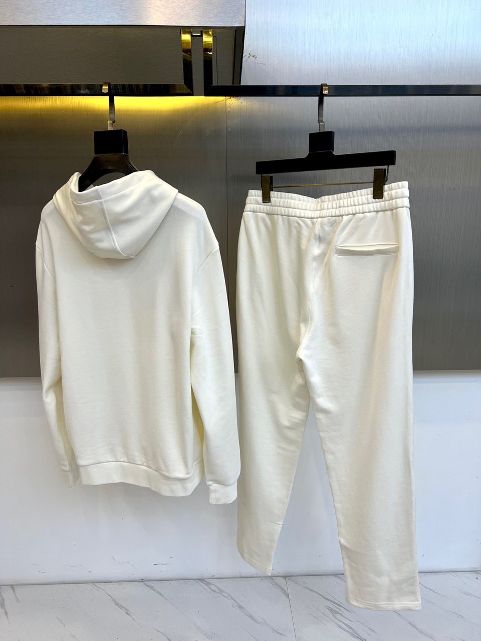 This Louis Vuitton urban tracksuit is the epitome of modern luxury, blending comfort with iconic design. The set includes a white hooded sweatshirt and matching casual pants, both crafted with meticulous attention to detail.