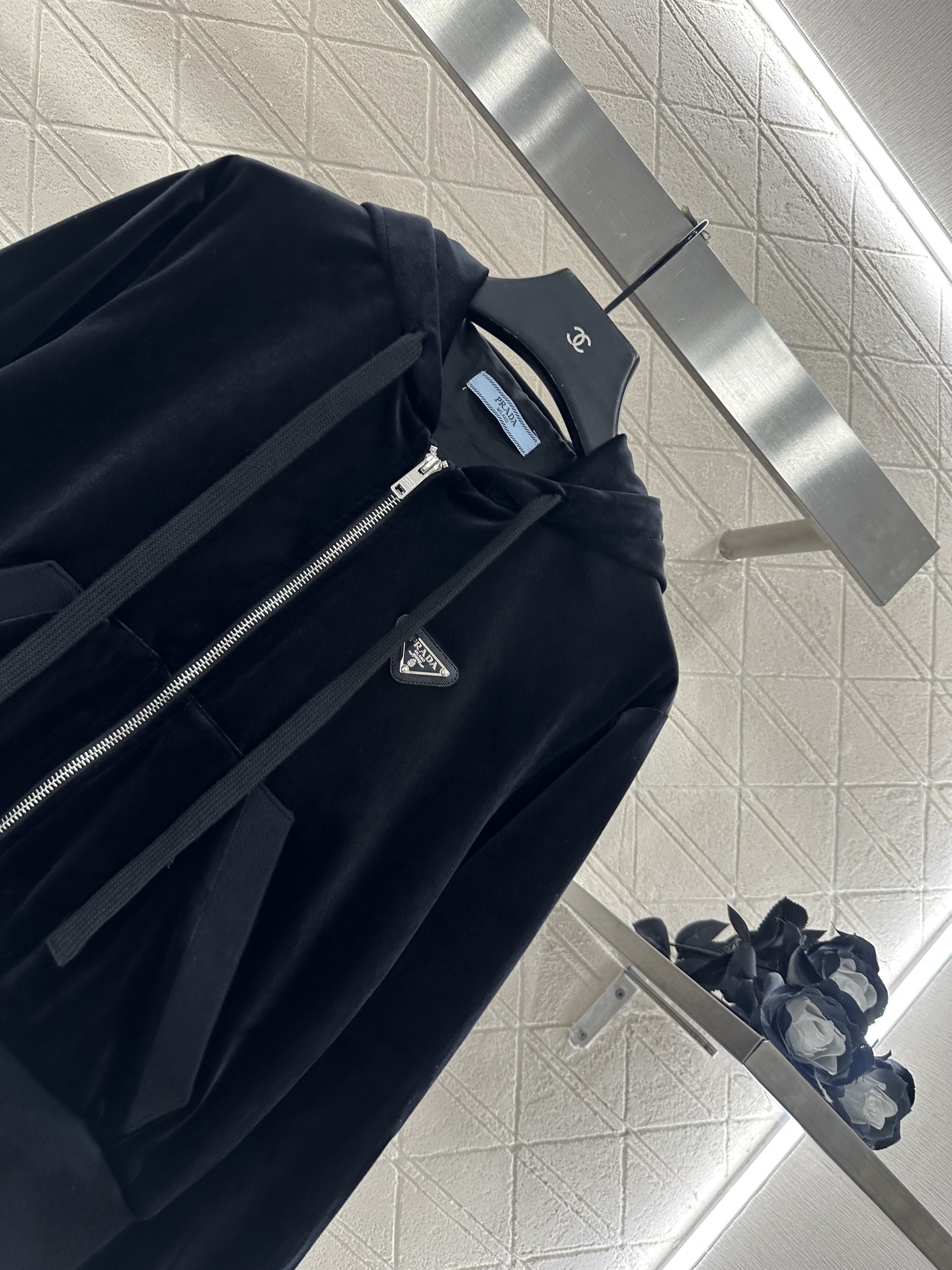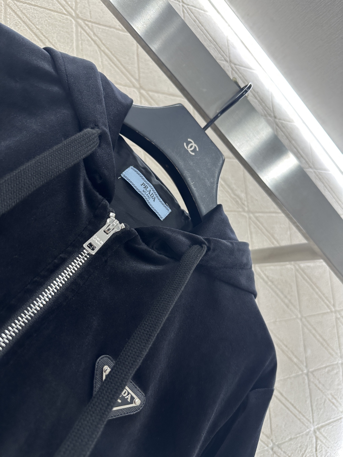 This Prada velour hoodie set is a must-have addition to your wardrobe, offering both comfort and high-end style.