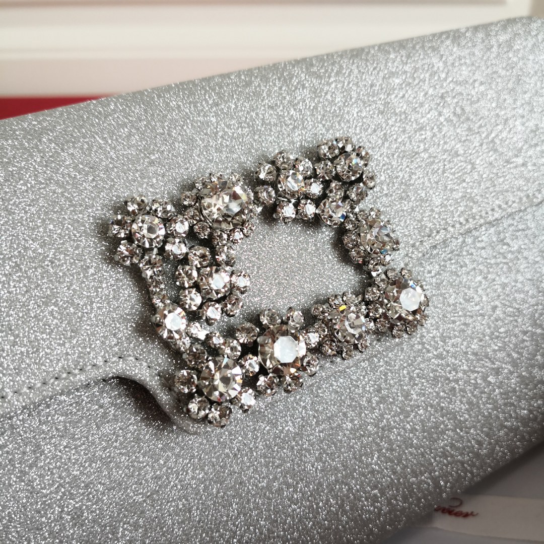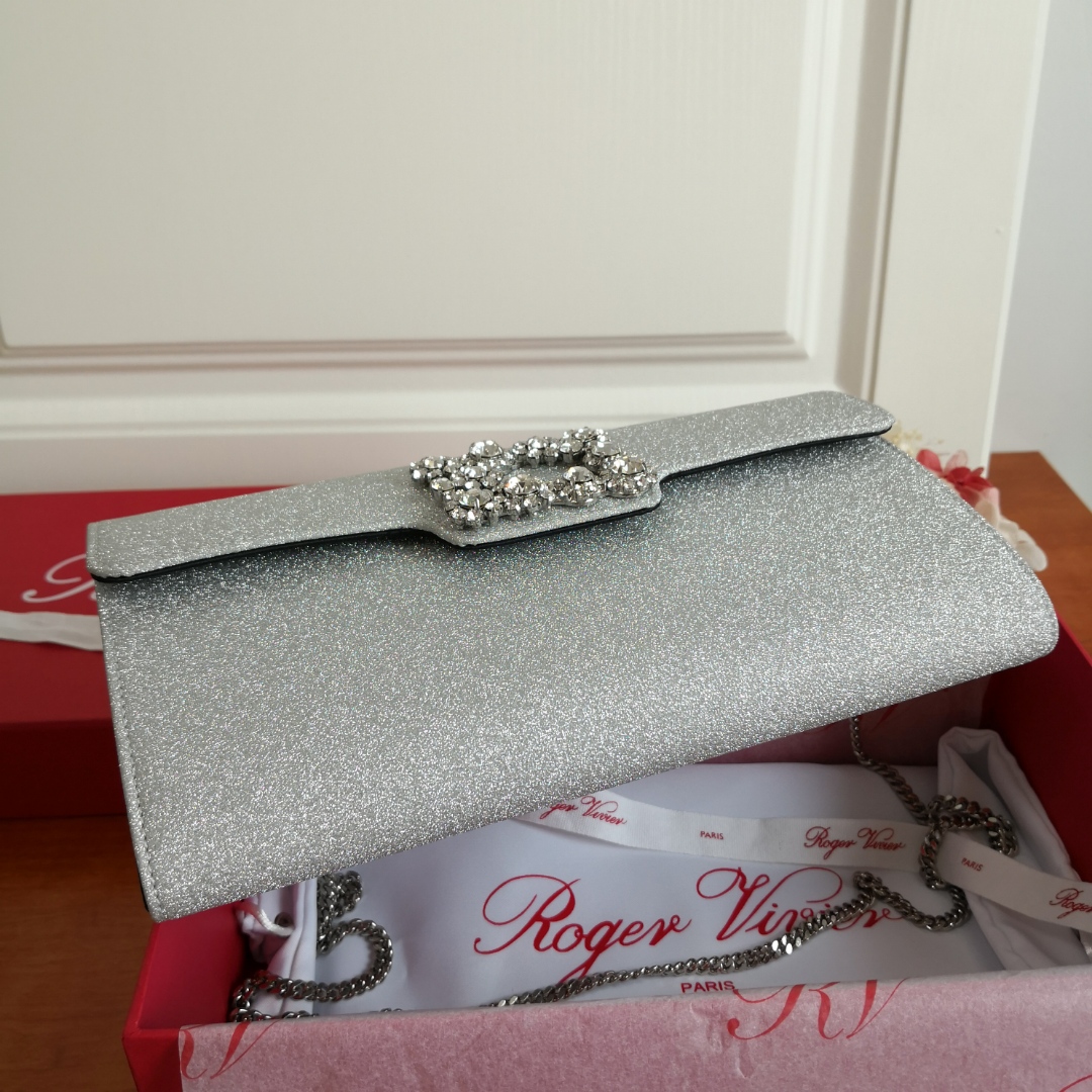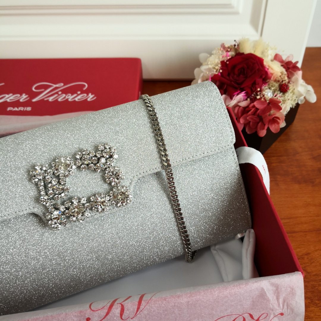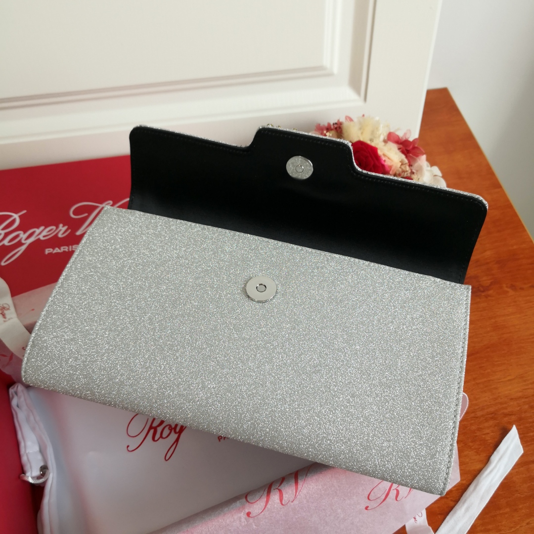 This Roger Vivier clutch is the perfect accessory to elevate your evening look. Its classic design and sparkling finish make it a timeless piece.