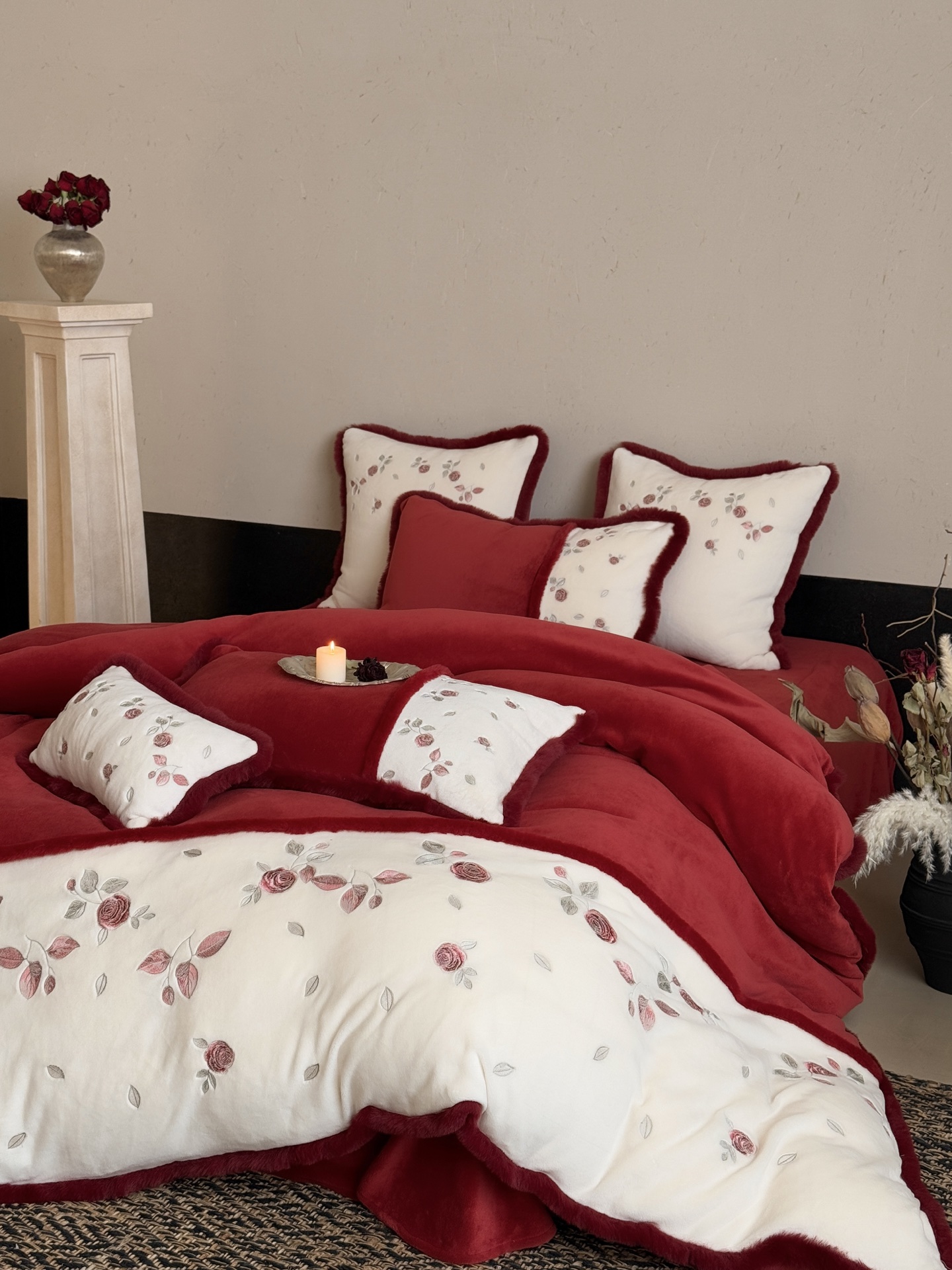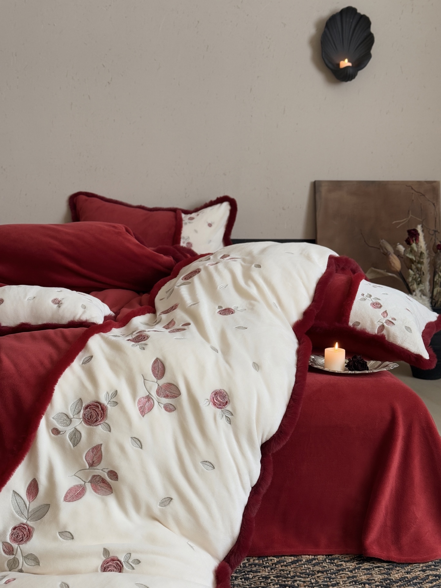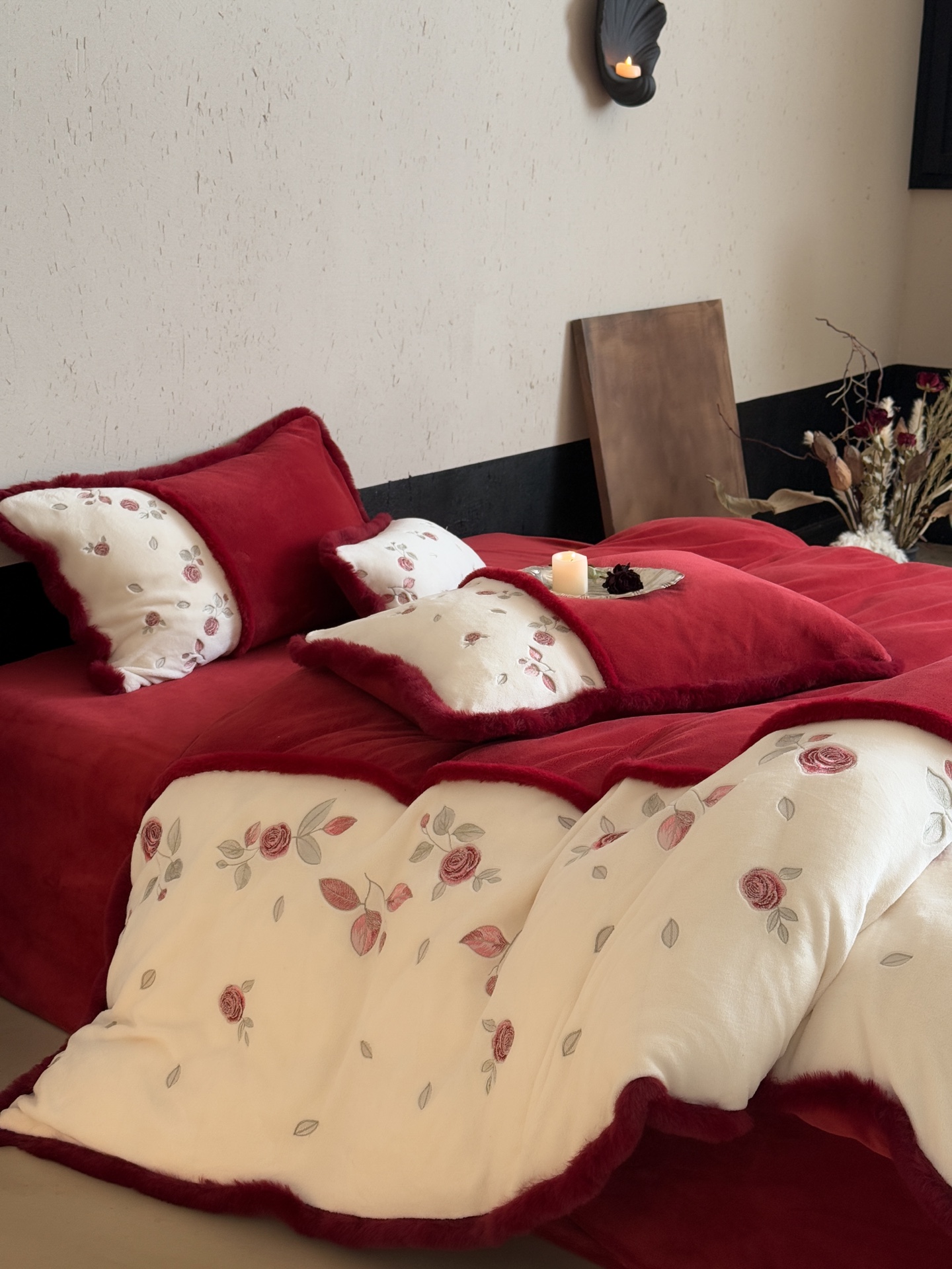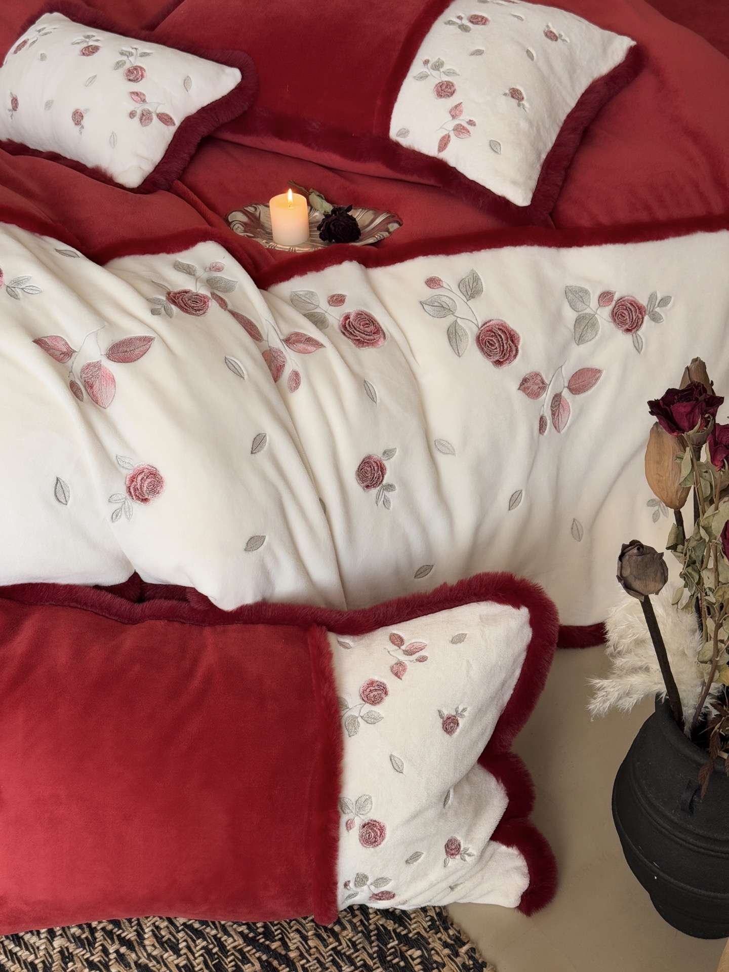 Indulge in the cozy luxury of this rose-embroidered bedding set. Crafted from high-count milk velvet, it offers unmatched softness and warmth for autumn and winter nights.