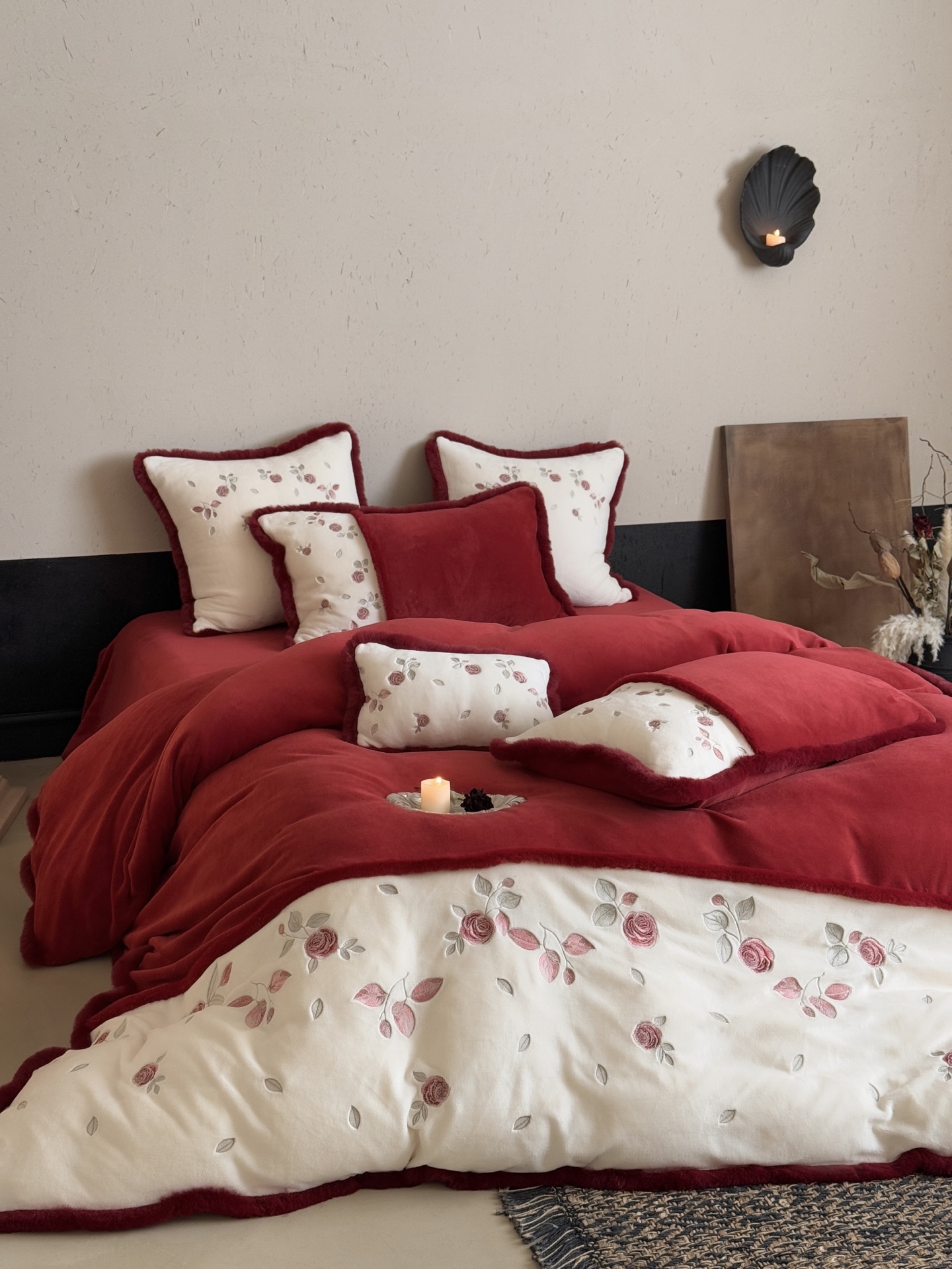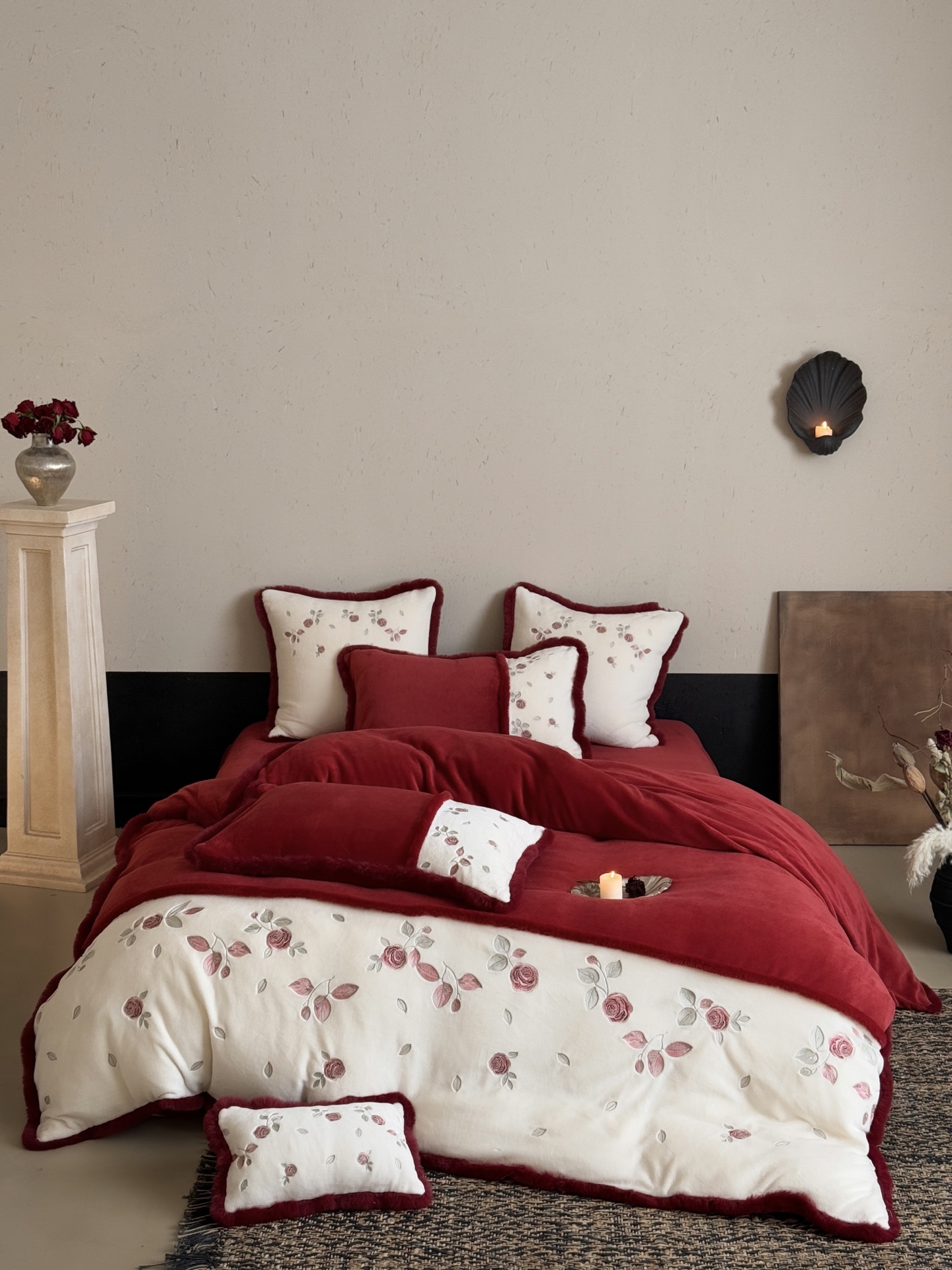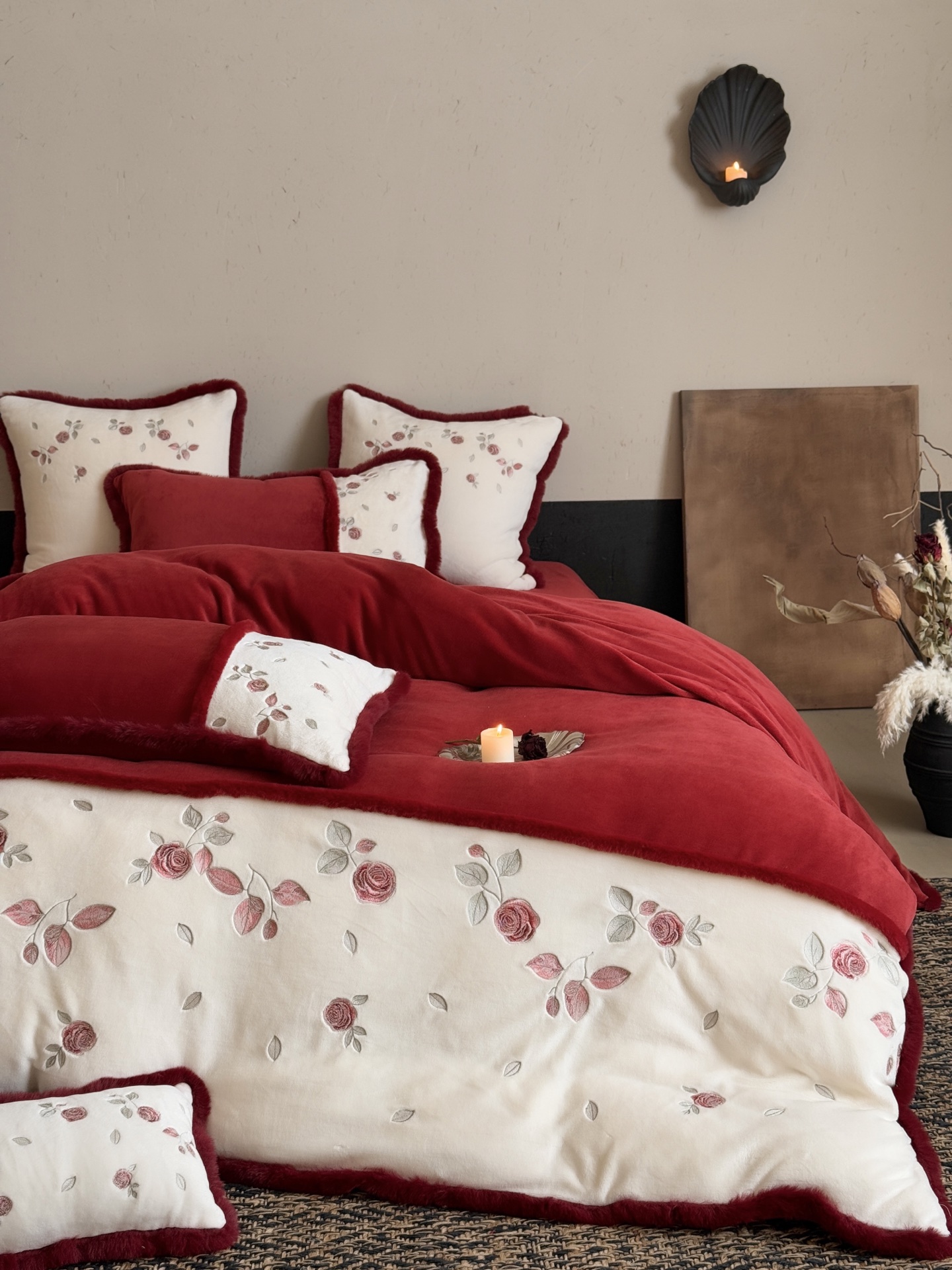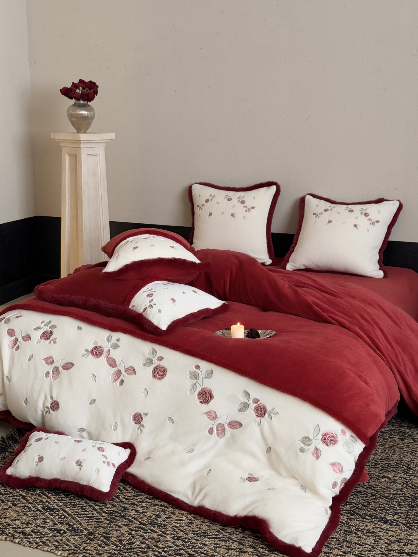 Indulge in the cozy luxury of this rose-embroidered bedding set. Crafted from high-count milk velvet, it offers unmatched softness and warmth for autumn and winter nights.