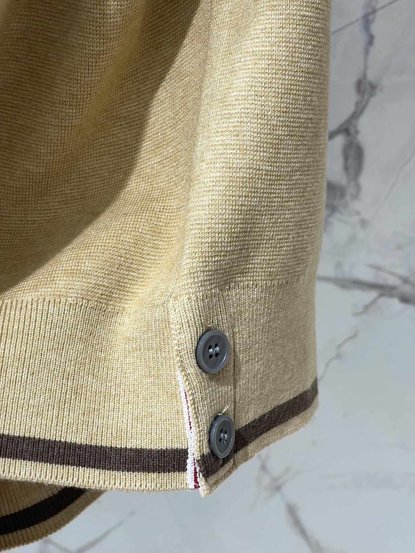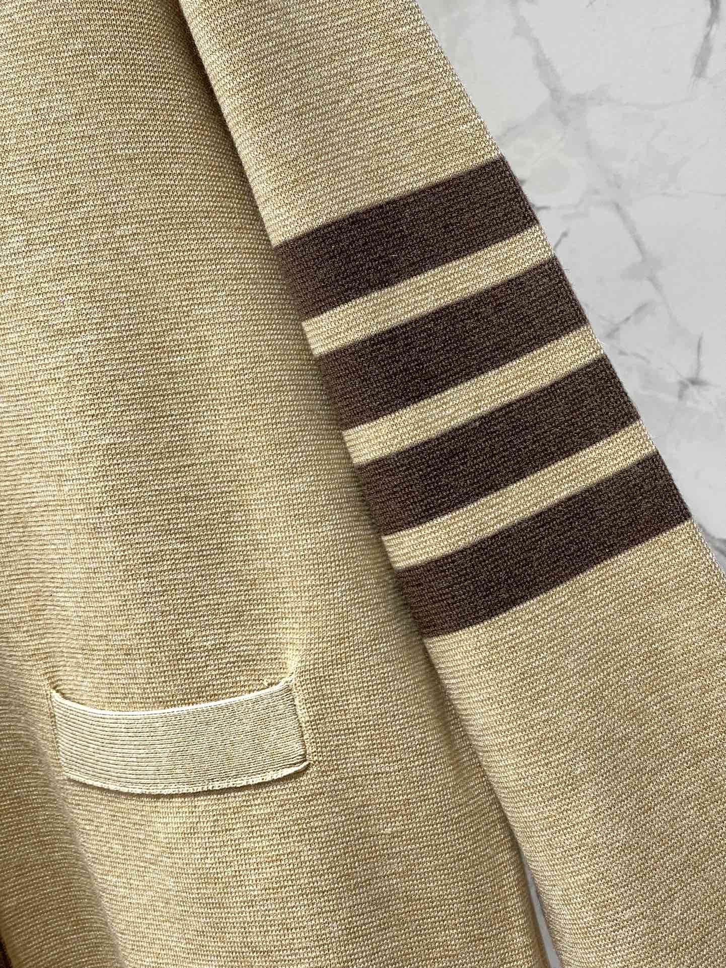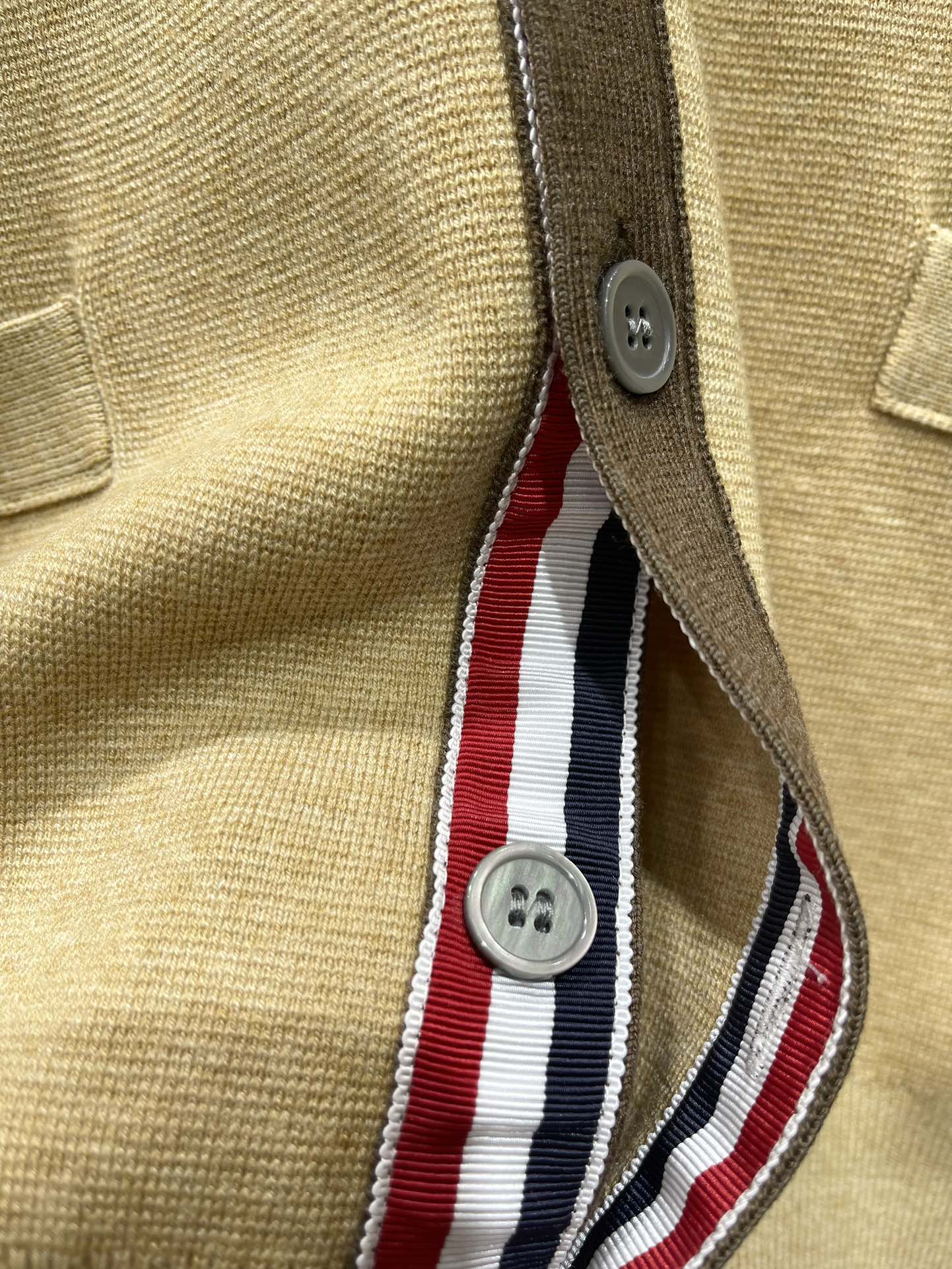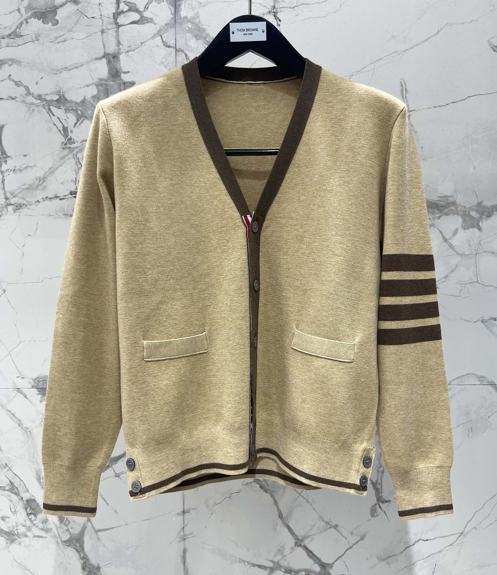 This cardigan is a classic piece that I'll be able to wear for years to come. The khaki color is so versatile, and the four-bar stripe adds a touch of personality.