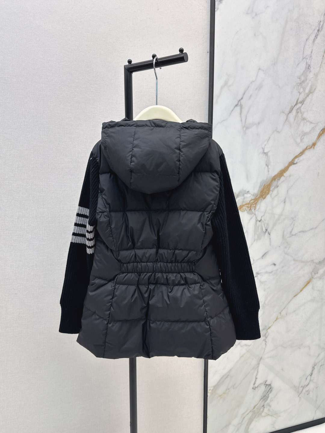 Tags: Designer Winter Coat, Hooded Down Jacket, Lightweight Down Jacket, Stylish Winter Jacket, Thom Browne Jacket, Wool Panelled Jacket