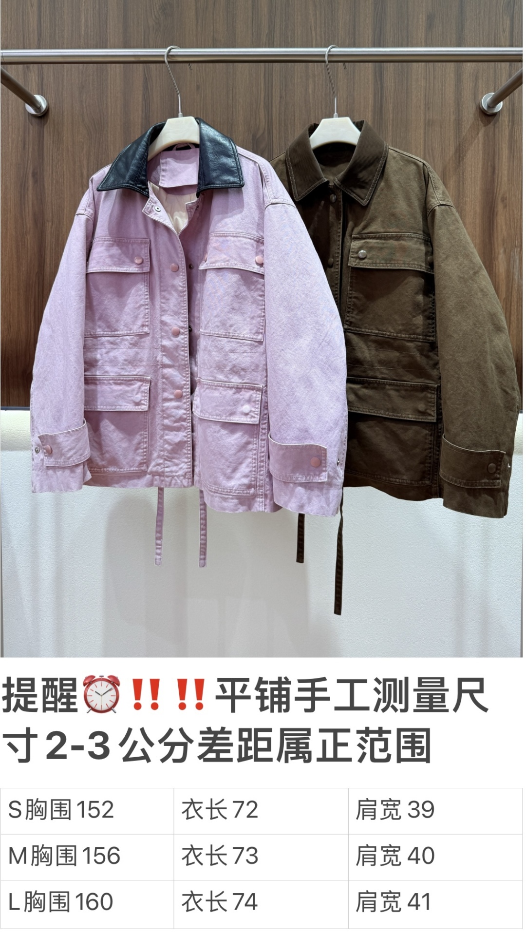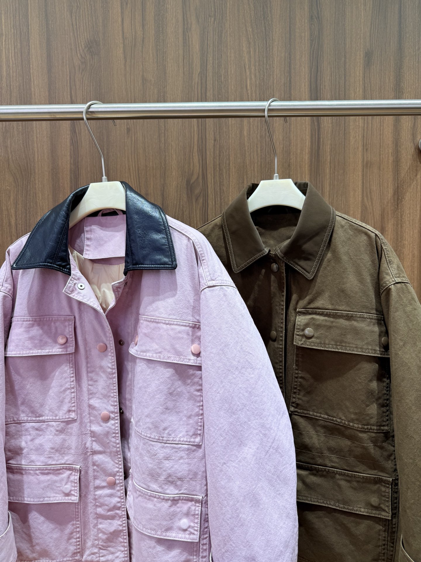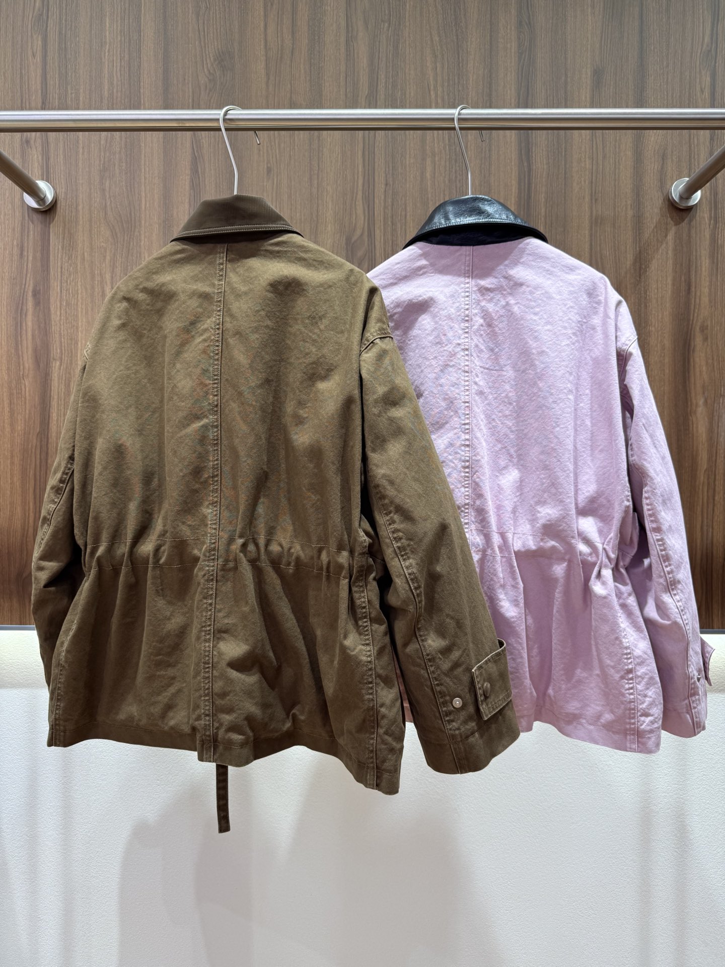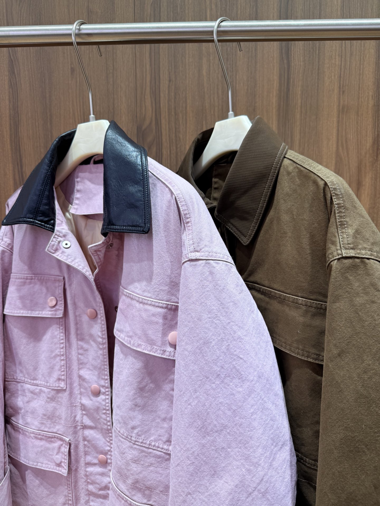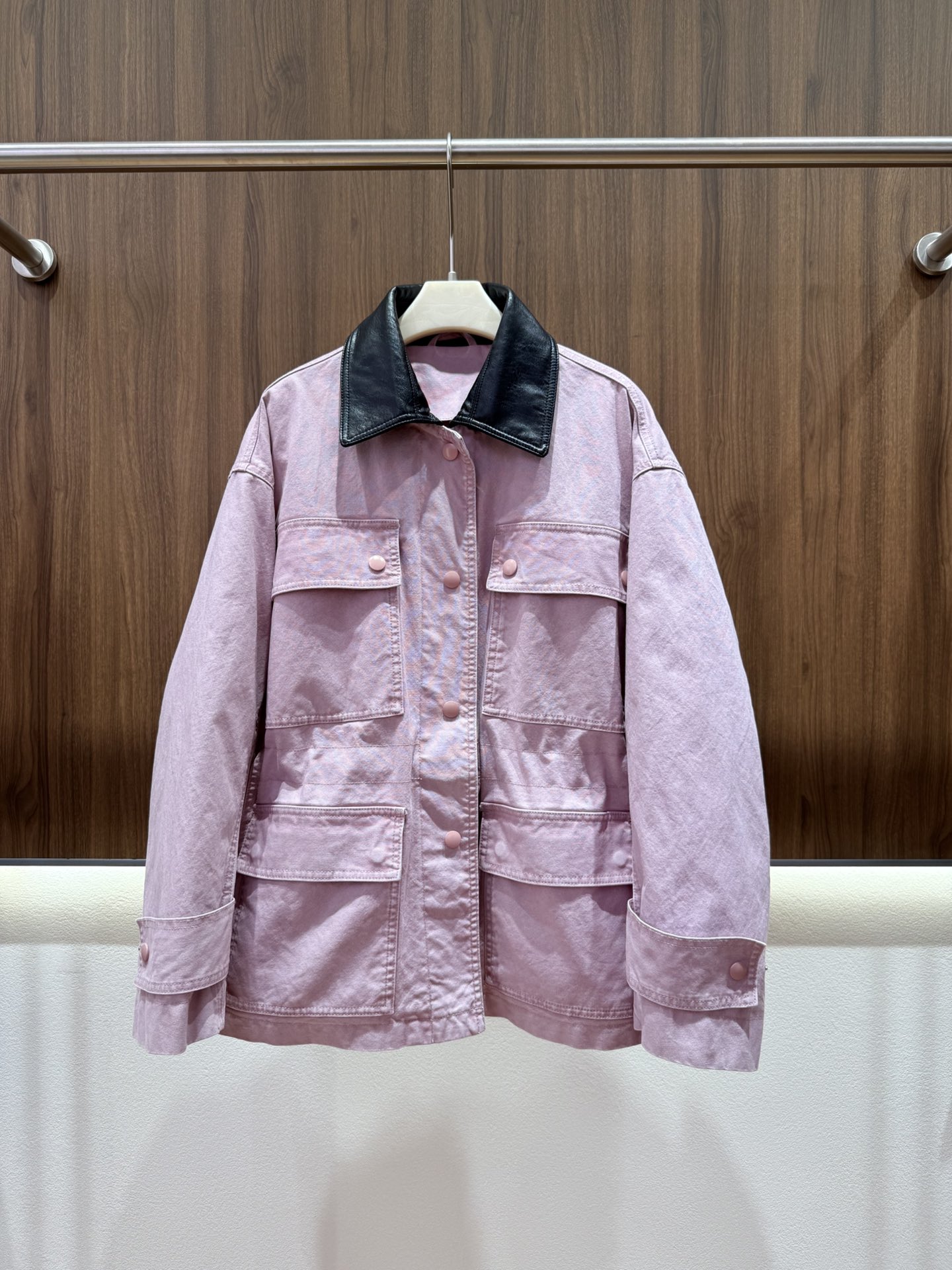 - Faux leather collar trim available in two colors.