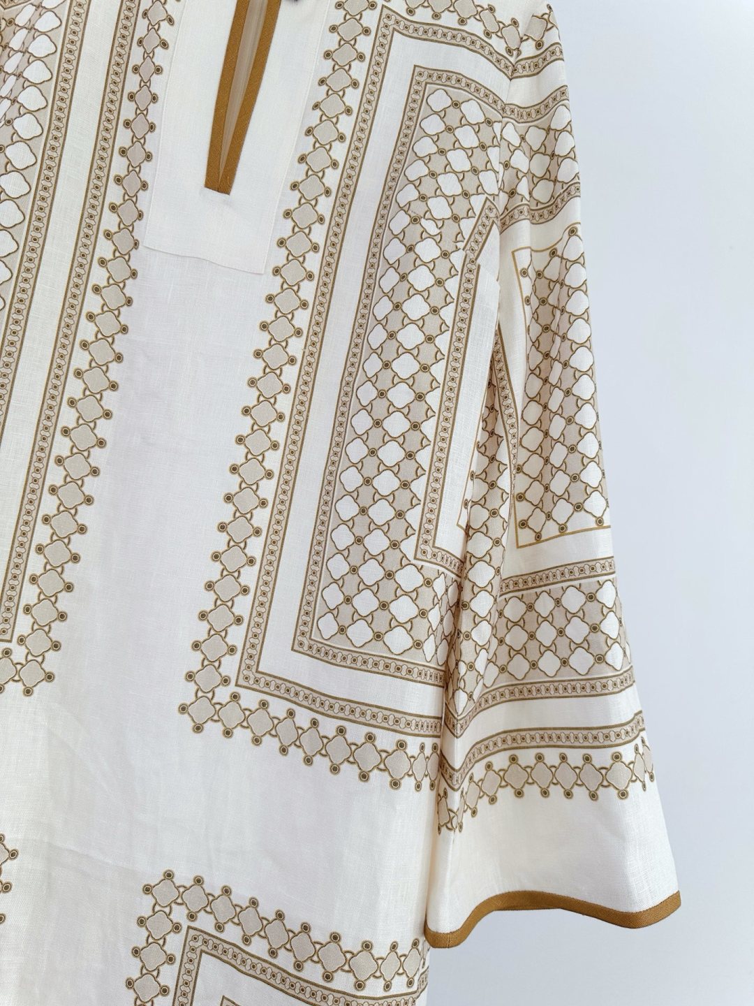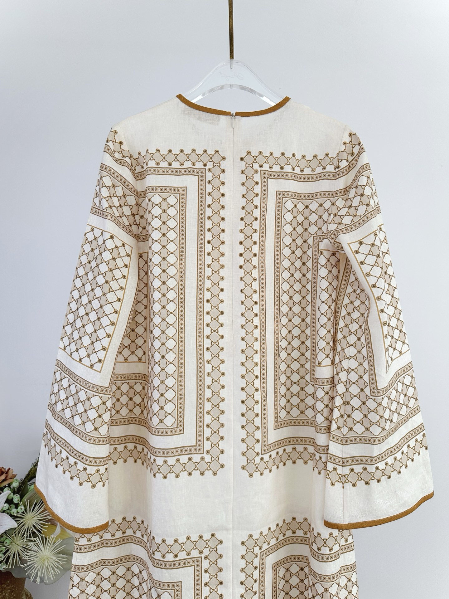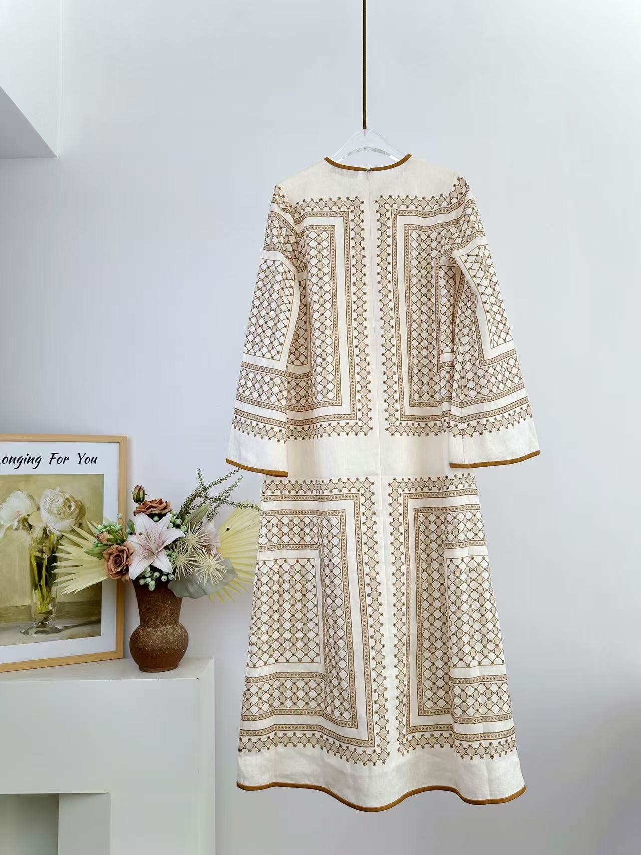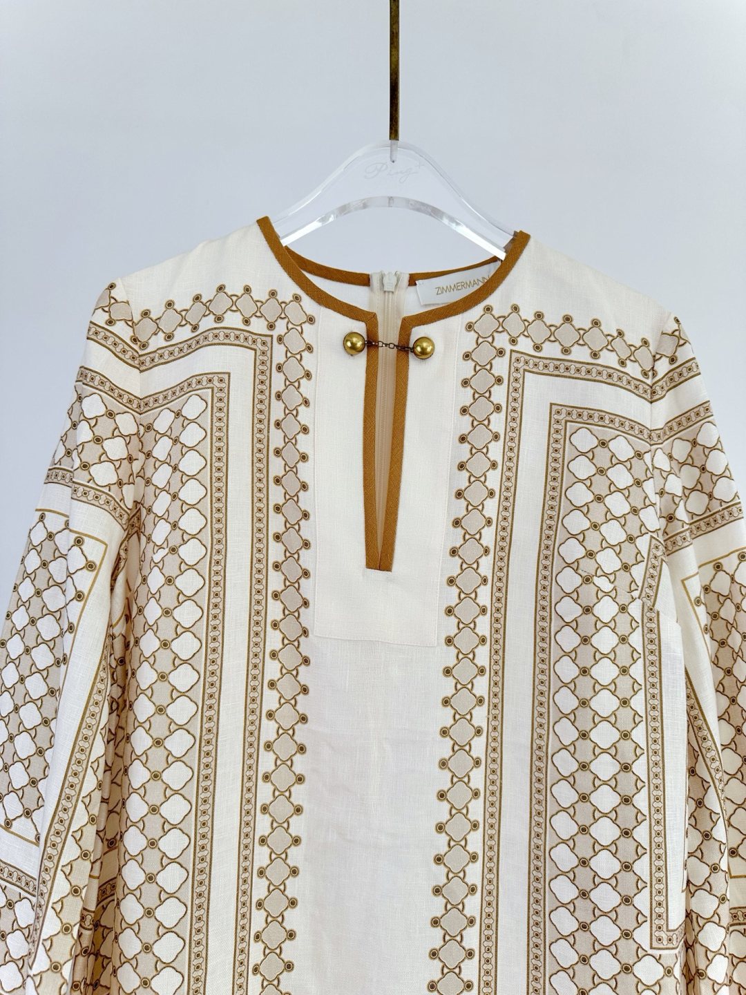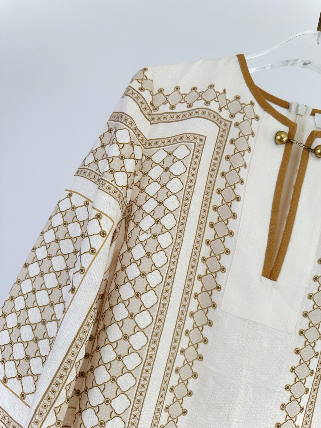 Elegant Zimmermann midi dress featuring long sleeves, a geometric print, and gold chain detail at the V-neck. Perfect for fall.