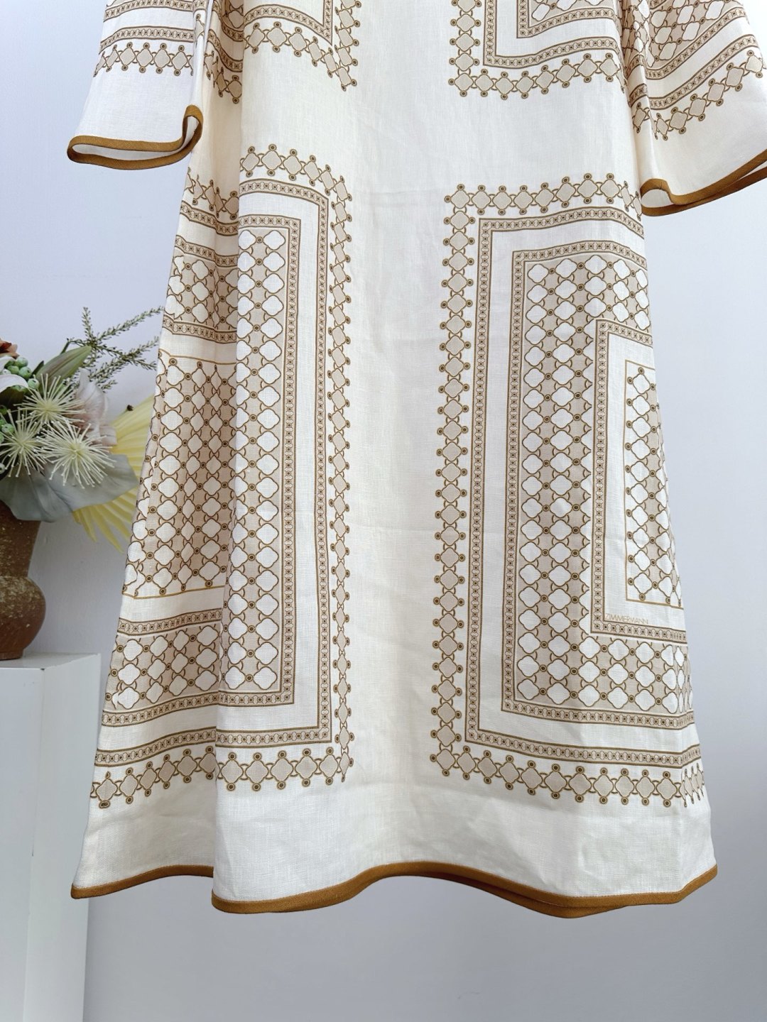 Zimmermann Hypnotic Long Sleeve Linen Midi Dress with Gold Chain Detail